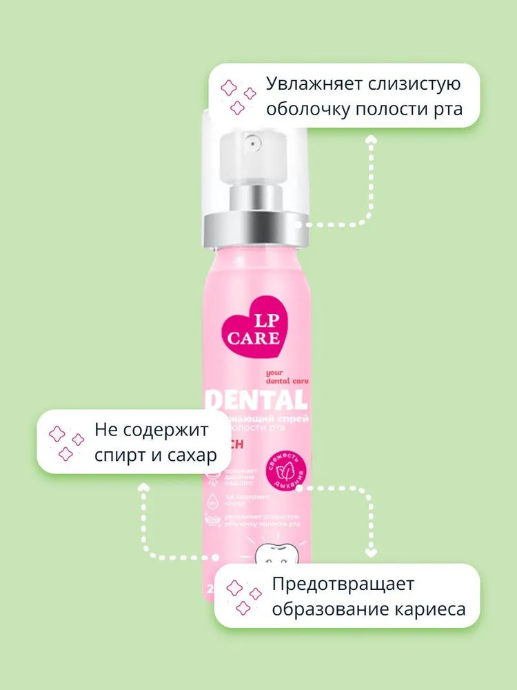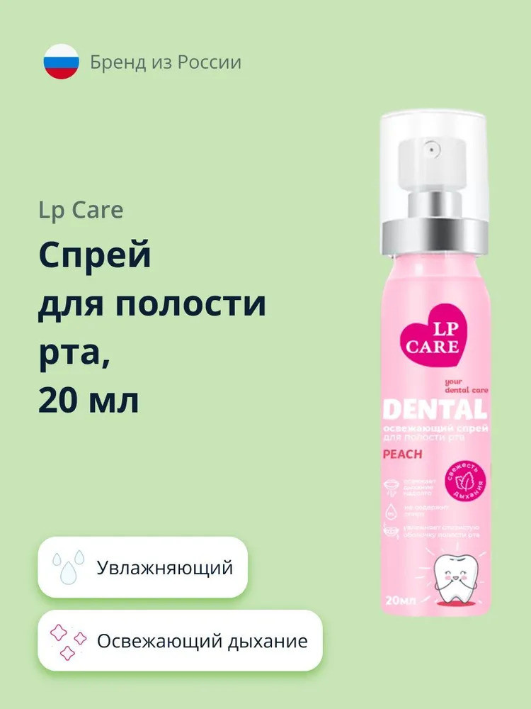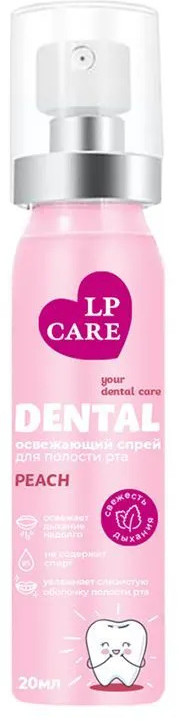 Спрей для полости рта LP Care Dental Peach с ароматом персика увлажняет слизистую оболочку полости рта, предотвращает образование кариеса и освежает дыхание надолго. Не содержит спирта и сахара. Победитель премии VOICE Beauty Awards-2024 среди лучших бьюти-запусков года в категории «Health Care».