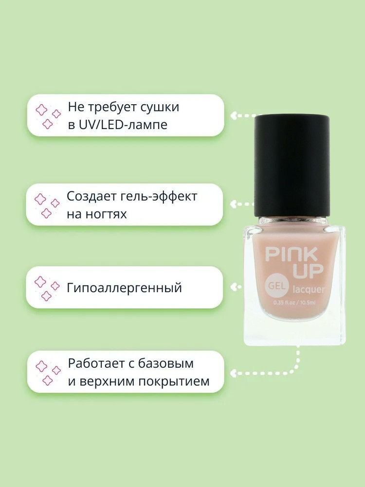 Способ применения: нанести 1-2 слоя на ногти поверх основы Pink Up Base Coat. После высыхания закрепить верхним покрытием PINK UP Top Coat. UV/LED лампа не требуется.