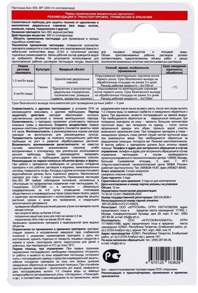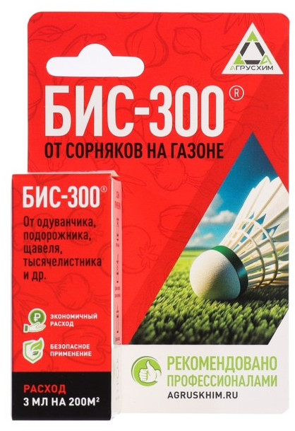 В данный момент этот товар отсутствует в продаже. Возможно, у нас найдется аналогичный или похожий товар здесь. БИС-300 — уникальный гербицид для борьбы с однолетними и многолетними сорняками на газоне и посадках земляники в период вегетации. Обладает избирательным действием, подавляя только сорную растительность. Полностью уничтожает не только наземную, но и корневую систему сорняков. БИС-300 отличается исключительно высокой эффективностью в борьбе с осотом, ромашкой, горцами, одуванчиками, подорожником и пр., уничтожает сорняки на всех стадиях развития. Хорошо проникает в листья сорных растений и быстро передвигается в корневища, прекращая рост, и вызывая отмирание как надземной, так и подземной части сорняка. Идеален для поддержания в чистоте взрослых газонов.