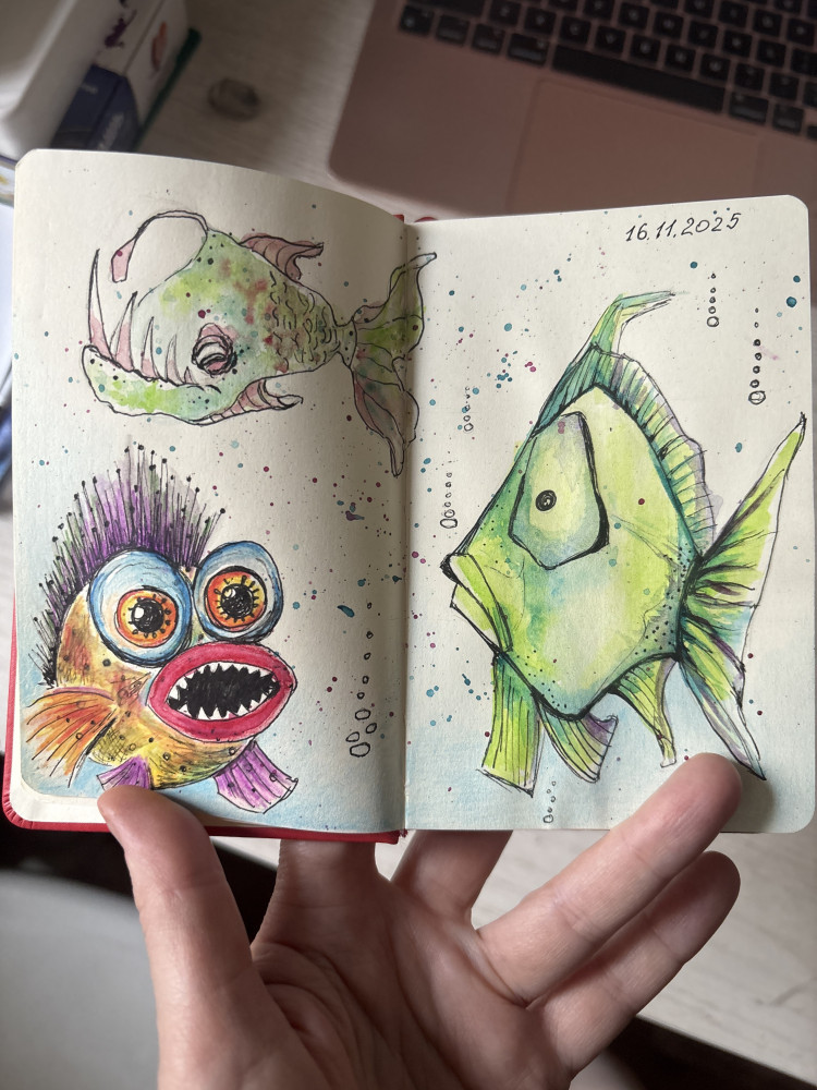Здесь мне особенно нравится, что бумага чуть желтоватая, а не чисто белая. Хотя у этого бренда есть и с чисто белыми листами скетчбуки. Для акварельных техник с обилием воды, наверное, не подойдет этот скетчбук, и пока не знаю, как поведет себя с маркерами или масляной пастелью. Но карандаши, перо, ручки, плюс акварель с умеренным количеством воды – прекрасно выдерживает👍