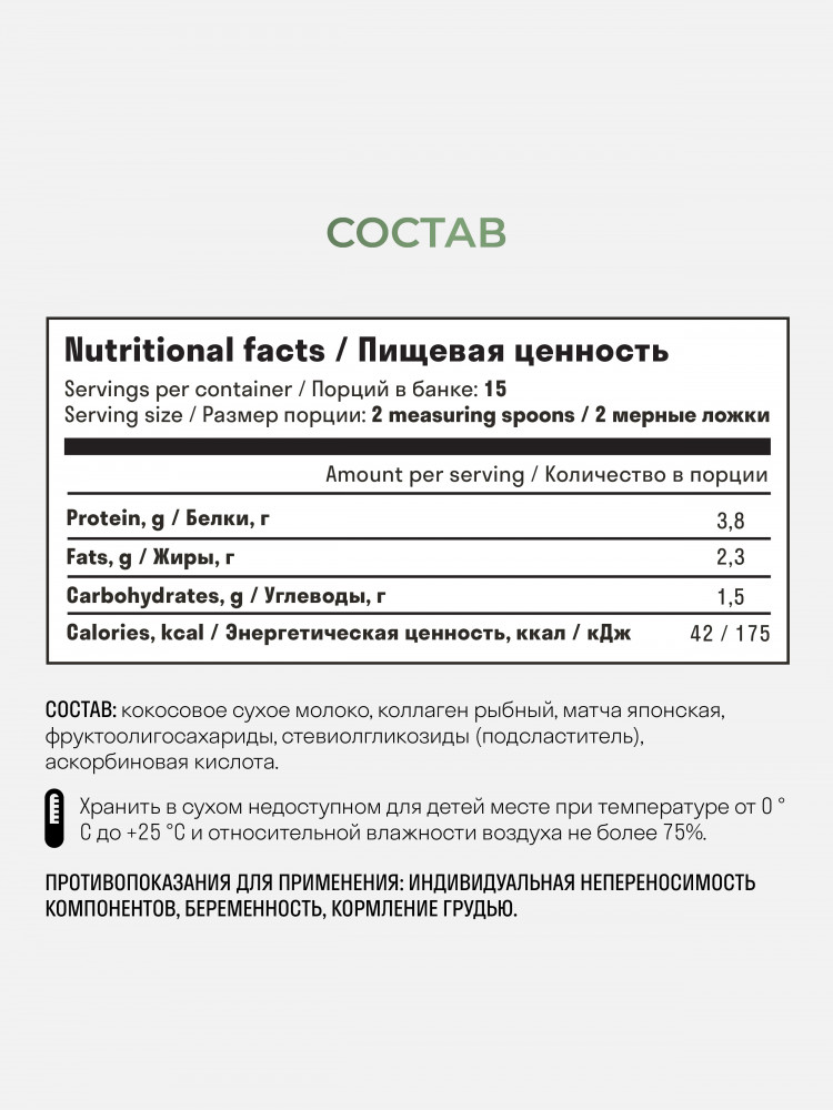 Матча может способствовать похудению и нормализовать процессы обмена веществ в организме человека. Матча может способствовать улучшению настроения, а также способен улучшать внимание, концентрацию и когнитивные способности человека в целом. В состав данного продукта сходит рыбный коллаген. Коллаген — структурный белок, присутствующий в большинстве тканей организма. Важнейшей его функцией является поставка спектра аминокислот для построения и поддержания здорового состояния опорно-двигательного аппарата, волос, кожного покрова, органов пищеварения и зрения. Главное преимущество и польза рыбного коллагена I типа оказывать плодотворное воздействие на состояние кожных и волосяных покровов, сухожилий, суставов, костей. Прием рыбных пептидов способствует регулированию степени увлажнения дермы, улучшает ее питание, повышает кожную эластичность, восстанавливают ее тугор, понижает скорость появления морщин, замедляет старение клеток, предотвращает образование растяжек и целлюлита. Также рыбный коллаген обладает противовоспалительным действием, за счет которого снижается риск получения травм и болевых ощущений во время интенсивных тренировок, уменьшается период реабилитации после травм, ускоряется восстановление организма.