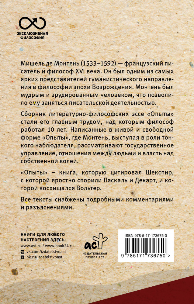 💳 Оплатить за товар можно при получении 🇰🇿 Есть бесплатная доставка по Казахстану от 1 дня 🎁 Копите бонусы с каждой покупки Серия: Эксклюзивная философия Мишель де Монтень (1533–1592) — французский писатель и философ XVI века. Он был одним из самых ярких представителей гуманистического направления в философии эпохи Возрождения. Монтень был мудрым и эрудированным человеком, что позволило ему заняться писательской деятельностью. |