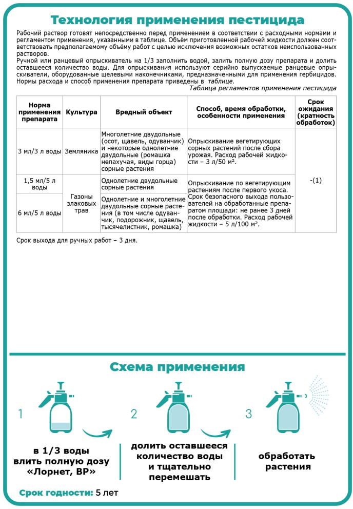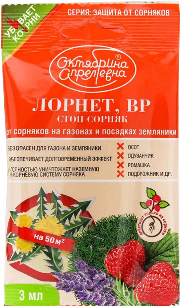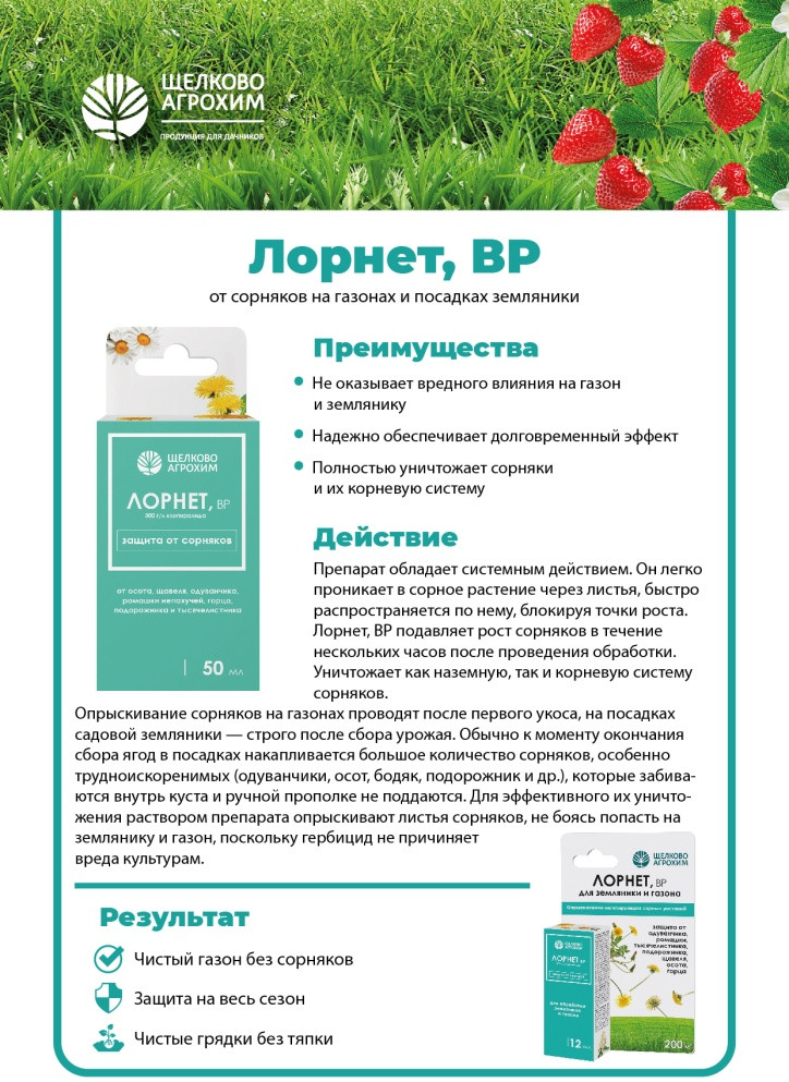 Средство от сорняков «Лорнет, ВР» обеспечивает защиту от широкого спектра сорных растений на посадках земляники, а также на газонах. Гербицид не оказывает вредного влияния на газон и землянику, полностью уничтожая сорняки и их корневую систему. «Лорнет, ВР» обладает системным действием, легко проникает в сорное растение через листья, быстро распространяется по нему, блокируя точки роста. Подавляет рост сорняков в течение нескольких часов после проведения обработки. Уничтожает как наземную, так и корневую систему сорняков.