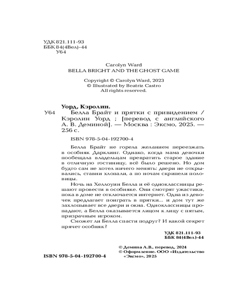💳 Оплатить за товар можно при получении 🇰🇿 Есть бесплатная доставка по Казахстану от 1 дня 🎁 Копите бонусы с каждой покупки Серия: Тени на стенах. Ужасы для подростков Погрузитесь в пугающую историю старого особняка и встретьтесь с настоящим призраком! Белла Брайт не горела желанием переезжать в особняк Дарклинг. Однако, когда мама девочки пообещала владельцам превратить старое здание в отличную гостиницу, всё было решено. Но дом будто сам не хотел ничего менять: двери не открывались, ставни хлопали, а по ночам скрипели половицы. Ночь на Хэллоуин Белла и ее одноклассницы решают провести в особняке. Они смотрят ужастики, пока в доме не отключается интернет. Одна из девочек предлагает поиграть в прятки... и дом тут же захлопывает все двери и окна. Одноклассницы пропадают, а Белла оказывается лицом к лицу с пятым, призрачным игроком. Сможет ли Белла спасти подруг? И какой секрет прячет особняк? |