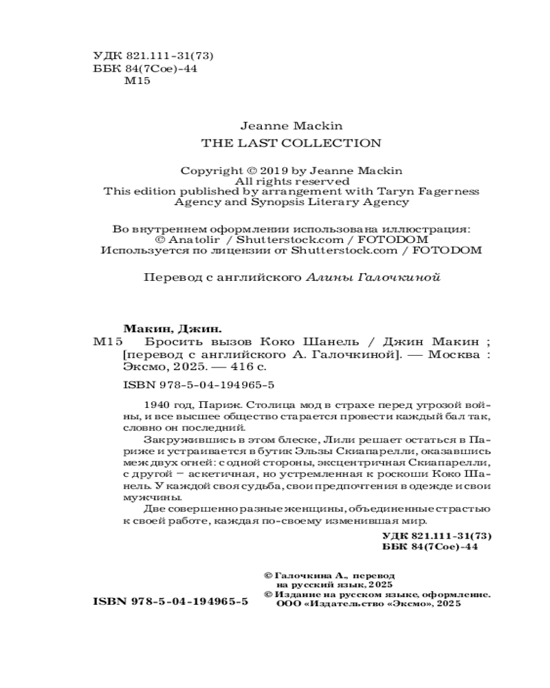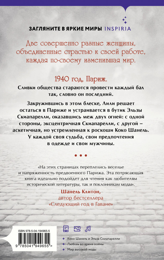 💳 Оплатить за товар можно при получении 🇰🇿 Есть бесплатная доставка по Казахстану от 1 дня 🎁 Копите бонусы с каждой покупки Серия: Novel. Страсть и искусство 1940 год, Париж. Столица мод в страхе перед угрозой войны, и все высшее общество старается провести каждый бал так, словно он последний. Закружившись в этом блеске, Лили решает остаться в Париже и устраивается в бутик Эльзы Скиапарелли, оказавшись меж двух огней: с одной стороны, эксцентричная Скиапарелли, с другой — аскетичная, но устремленная к роскоши Коко Шанель. У каждой своя судьба, свои предпочтения в одежде и свои мужчины. Две совершенно разные женщины, объединенные страстью к своей работе, каждая по-своему изменившая мир. |