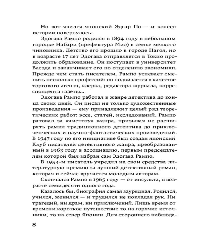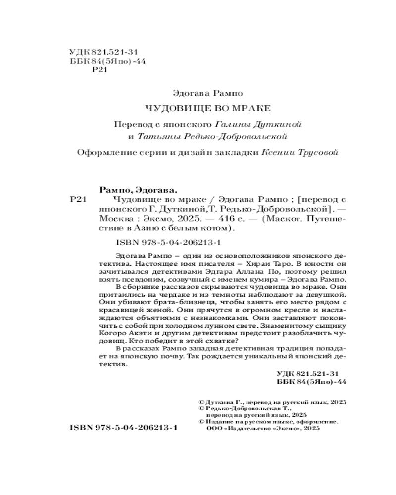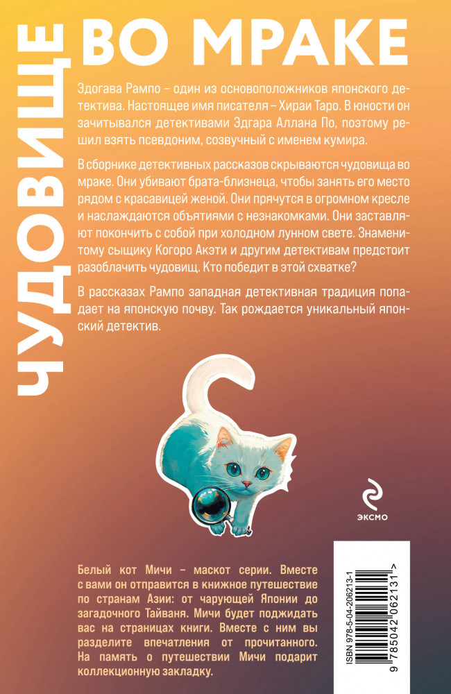 💳 Оплатить за товар можно при получении 🇰🇿 Есть бесплатная доставка по Казахстану от 1 дня 🎁 Копите бонусы с каждой покупки Серия: Маскот. Путешествие в Азию с белым котом Эдогава Рампо — один из основоположников японского детектива. Можно сказать, что именно он проложил дорогу современному писателю Содзи Симада и его романам «Токийский Зодиак» и «Дом кривых стен». Настоящее имя Рампо — Хираи Таро. В юности он зачитывался детективами Эдгара Аллана По, поэтому решил взять псевдоним, созвучный с именем кумира — Эдогава Рампо. В сборнике рассказов скрываются чудовища во мраке. Они притаились на чердаке и из темноты наблюдают за девушкой. Они убивают брата-близнеца, чтобы занять его место рядом с красавицей женой. Они прячутся в огромном кресле и наслаждаются объятиями с незнакомками. Они заставляют покончить с собой при холодном лунном свете. Знаменитому сыщику Когоро Акэти и другим детективам предстоит разоблачить чудовищ. Кто победит в этой схватке? |