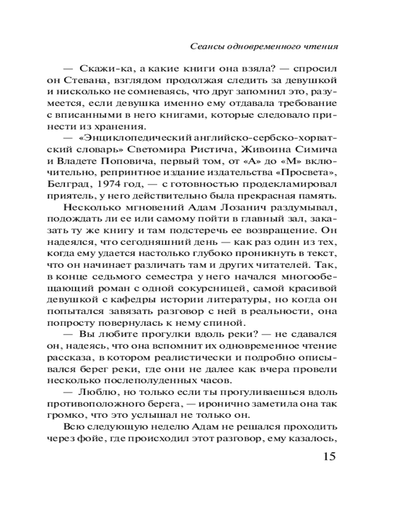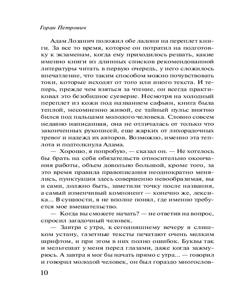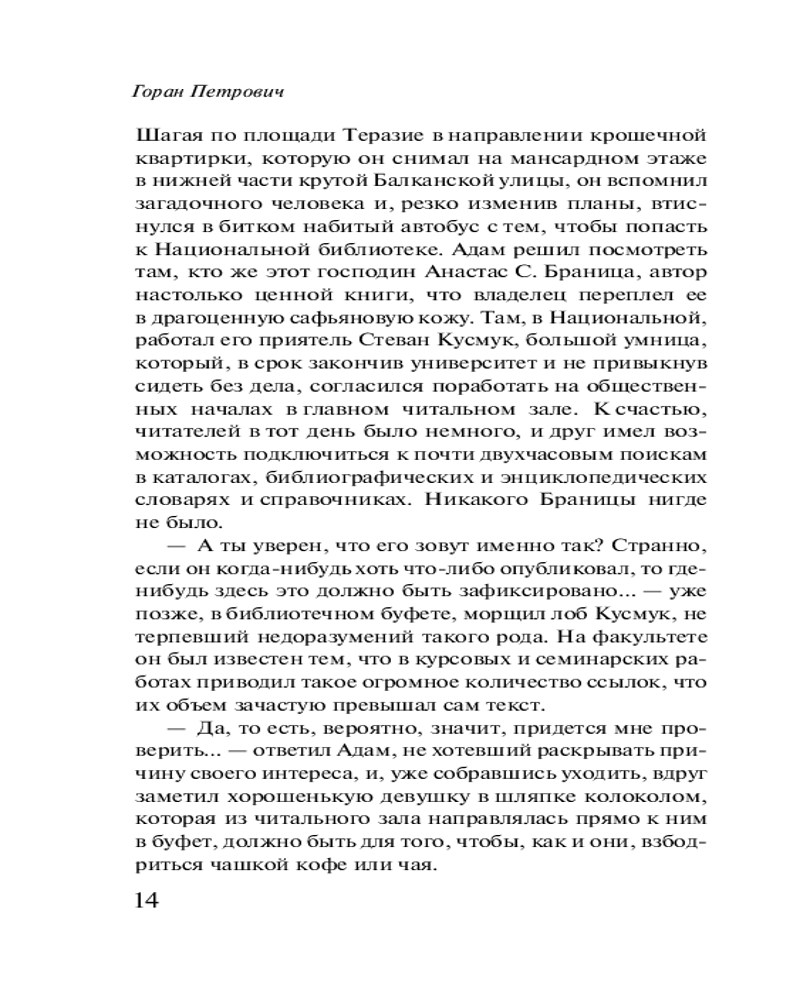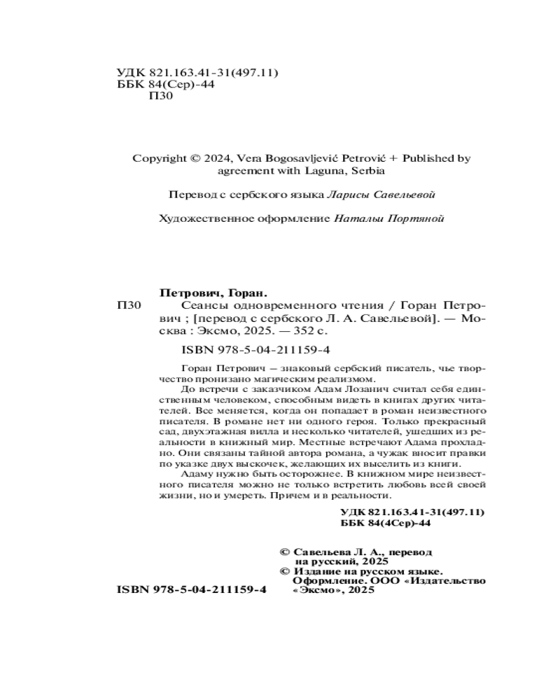 💳 Оплатить за товар можно при получении 🇰🇿 Есть бесплатная доставка по Казахстану 🎁 Копите бонусы с каждой покупки Серия: Магистраль. Балканская коллекция Адам Лозанич как раз один из немногих. Он получает необычный заказ — отредактировать книгу неизвестного писателя. Юноша погружается в роман и понимает, что в нем нет ни одного героя. Только прекрасный сад, двухэтажная вилла и несколько читателей, ушедших из реальности в книжный мир. Местные встречают Адама прохладно. Они связаны тайной автора романа, а чужак вносит правки по указке двух выскочек, желающих их выселить из книги. Адаму нужно быть осторожнее. В книжном мире неизвестного писателя можно не только встретить любовь всей своей жизни, но и умереть. Причем и в реальности. Если вам понравились произведения Хорхе Луиса Борхеса, Габриэля Гарсиа Маркеса, Хулио Кортасара, Умберто Эко, Теодора Гофмана и Милорада Павича, то эта книга Горана Петровича для вас. |