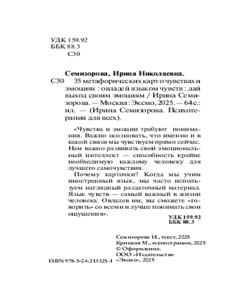 💳 Оплатить за товар можно при получении 🇰🇿 Есть бесплатная доставка по Казахстану от 1 дня 🎁 Копите бонусы с каждой покупки Серия: Ирина Семизорова. Психотерапия для всех От автора бестселлеров «Про твою же мать» и «Нереальная любовь», психолога и блогера Ирины Семизоровой. 35 карт в уютном удобном коробе и подробная инструкция о том, как работать со своими эмоциями. Почему карточки? Когда мы учим иностранный язык, мы часто используем наглядный раздаточный материал. Язык чувств — самый важный в жизни человека. Овладев им, вы сможете «говорить» со всеми и лучше понимать свои ощущения. |