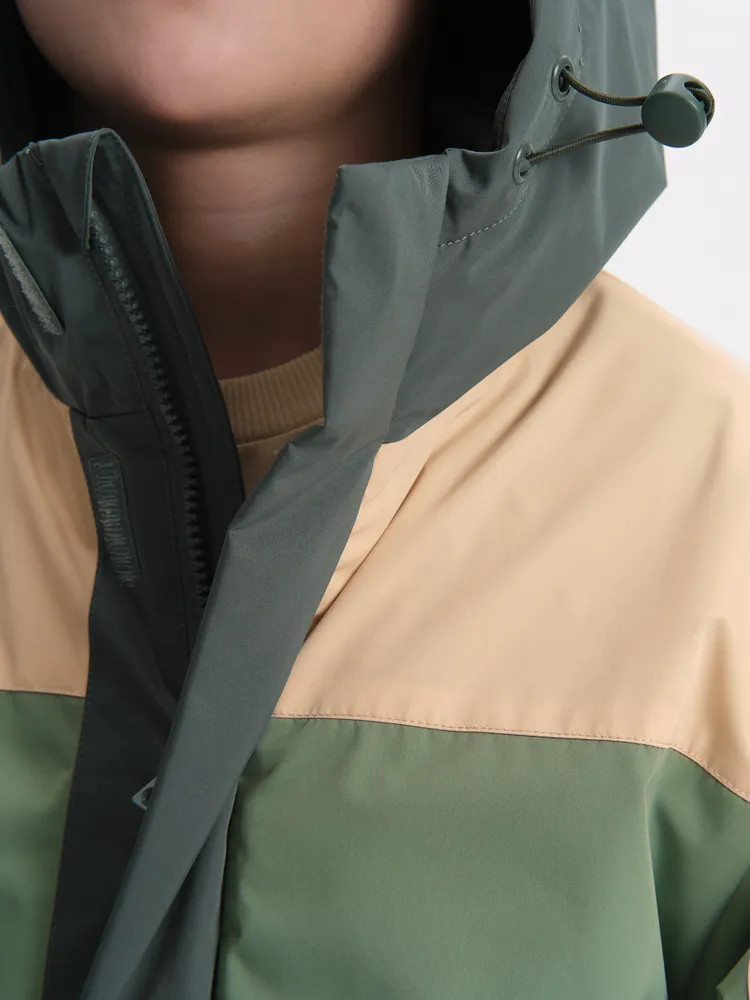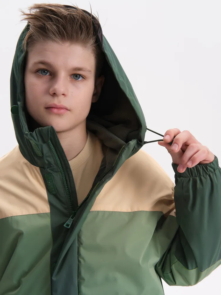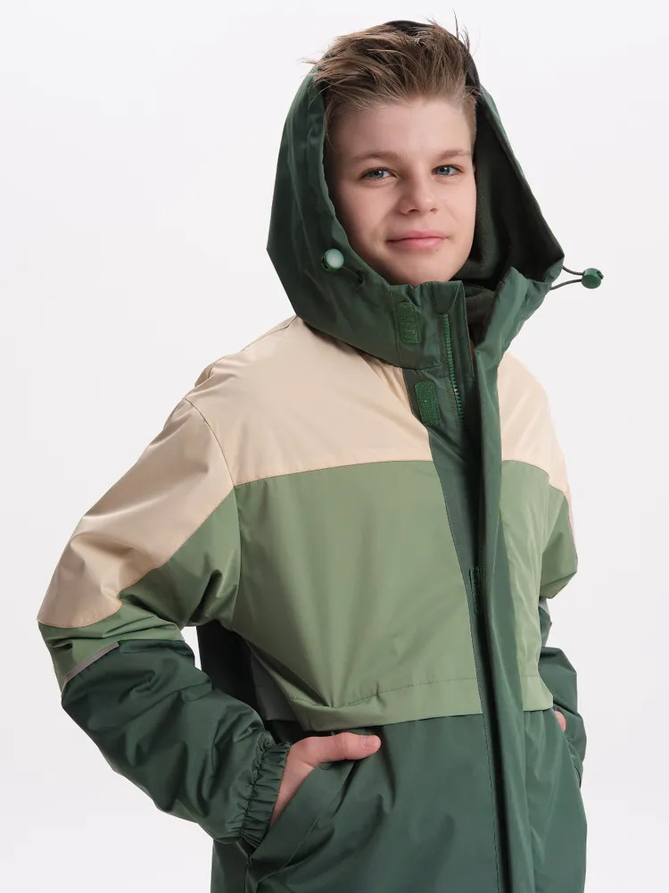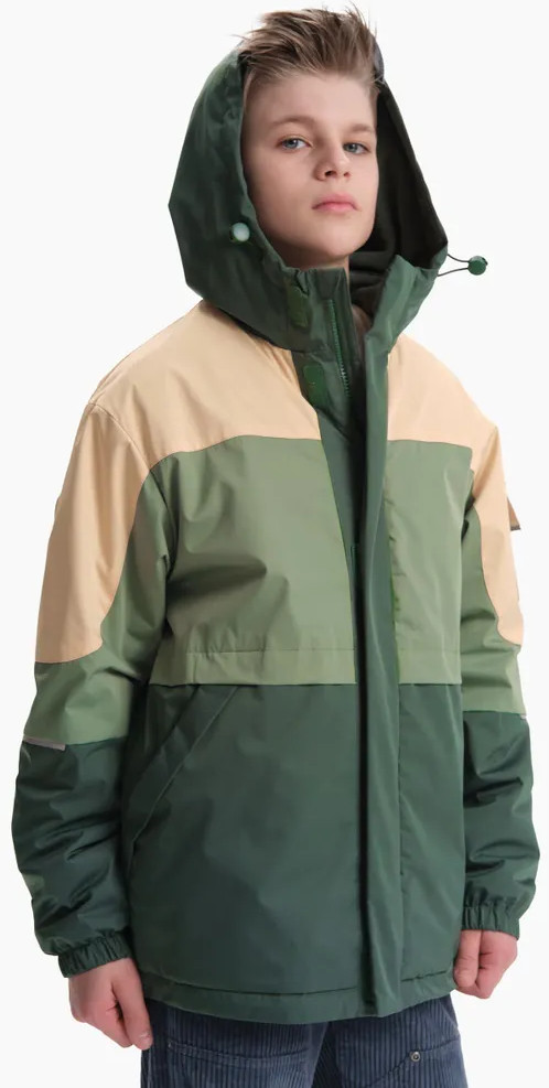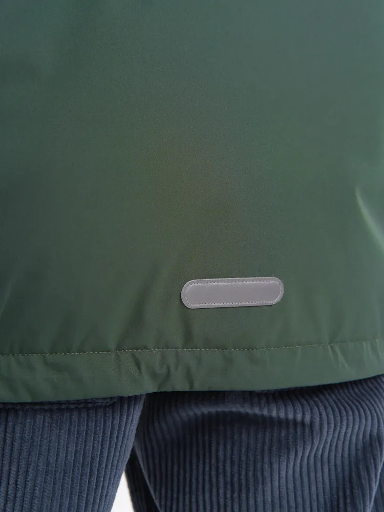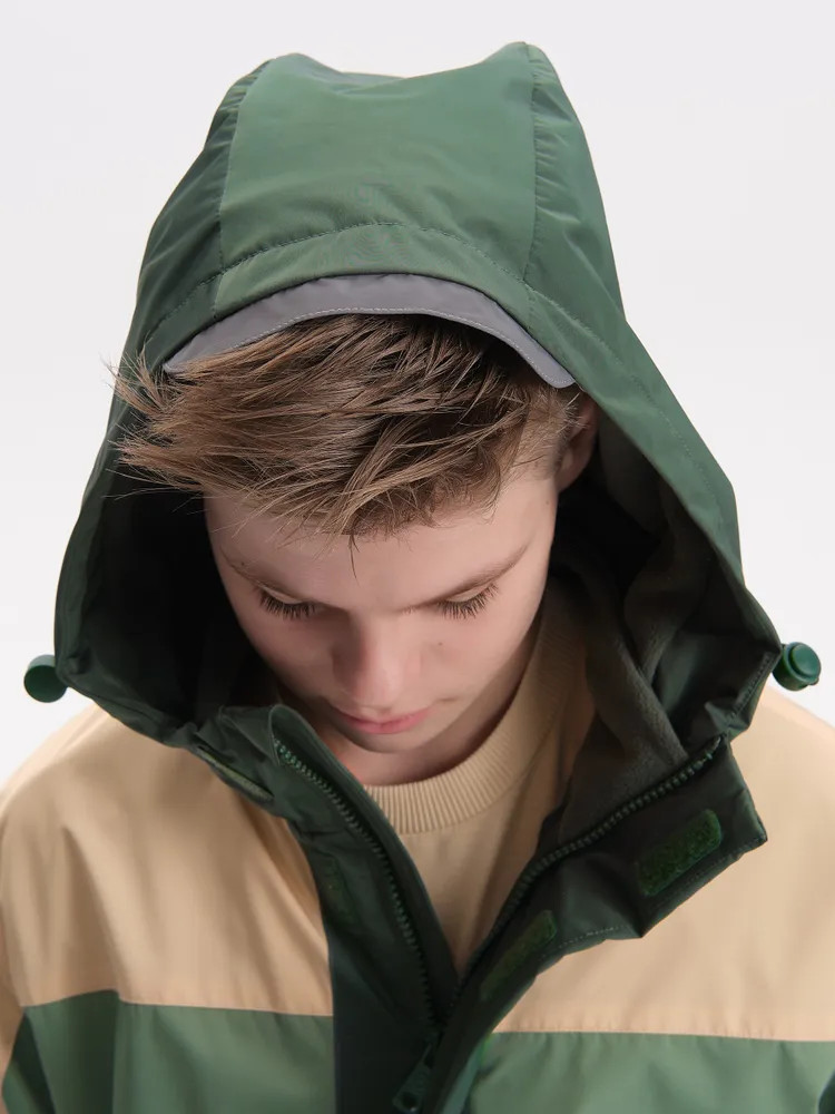 Ветровка с капюшоном. Двухшовный глубокий капюшон с козырьком из светоотражающего материала обеспечивает защиту от ветра и дождя и повышает безопасность в условиях низкой видимости. Прочная тракторная молния с защитой подбородка и удобным пуллером, что делает процесс застегивания максимально удобным для ребёнка. Под молнией ветрозащитная планка.