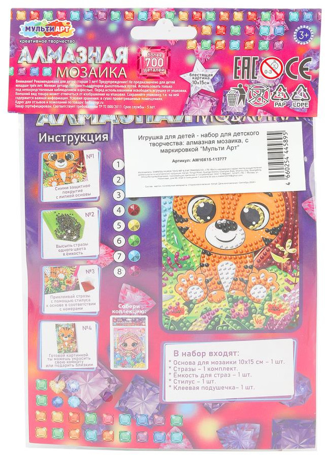 💳 Оплатить за товар можно при получении 🇰🇿 Есть бесплатная доставка по Казахстану 🎁 Копите бонусы с каждой покупки Набор для детского творчества — алмазная мозаика «Тигра» ТМ «Мульти Арт» — отличный подарок для ребёнка, который будет способствовать развитию его творческих способностей. При помощи этого набора маленький художник сможет создать красочную картинку-мозаику, декорированную разноцветными стразами. Яркую поделку можно подарить близким или использовать для украшения комнаты. |