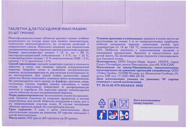 Способ применения: снимите защитную пленку и положите таблетку в отсек для моющих средств посудомоечной машины. Закройте отсек и включите посудомоечную машину, запрограммировав ее, как описано в инструкции по ее эксплуатации. Для одной мойки достаточно одной таблетки. Всегда закрывайте упаковку после использования. Не рекомендуется мыть посуду из фарфора, хрусталя, меди, мельхиора, латуни, серебра, дерева, алюминия, а также посуду с тефлоновым покрытием и декорированную золотом и серебром. На коротких циклах рекомендуется класть таблетку на дно посудомоечной машины