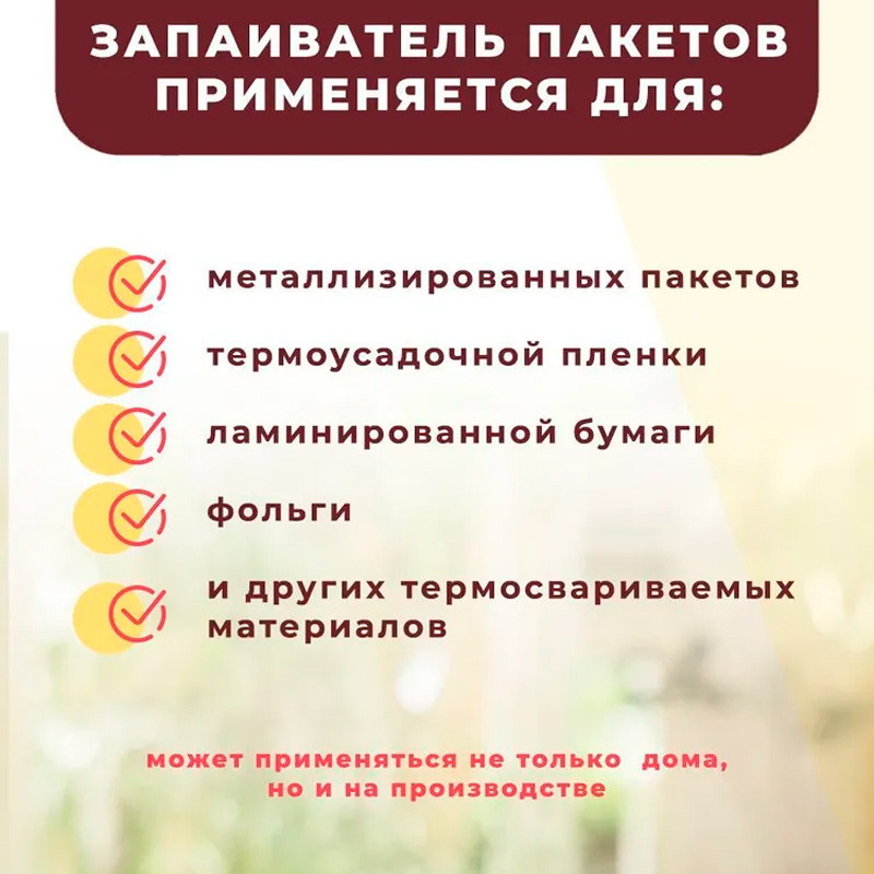 💳 Оплатить за товар можно при получении 🇰🇿 Есть бесплатная доставка по Казахстану от 1 дня 🎁 Копите бонусы с каждой покупки Импульсный запайщик пакетов PFS-300 имеет максимальную длину запайки 300 мм и ширину шва 2 мм. Регулируемое время нагрева 0.2-1.3 с. Предназначен для работы с готовыми пакетами или изготовления пакетов из рукава. Запайщик оснащен боковым ножом для отреза пленки. Запайщики серии «PFS» широко используются для упаковки продуктов питания, специальных продуктов, чая, медикаментов. |