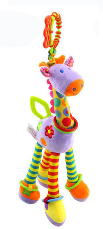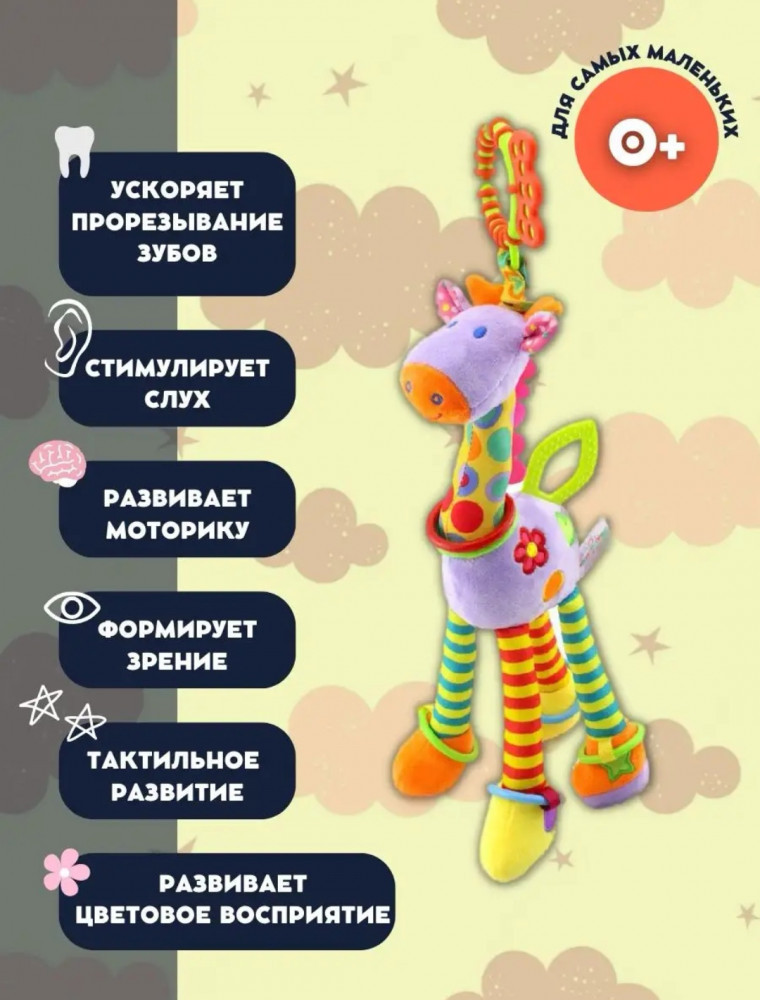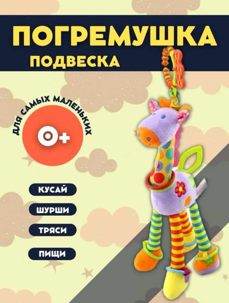 Игрушка представлена в виде прекрасного жирафика. Мягкая и интересная, эта погремушка подвеска станет надежным компаньоном вашего ребенка как в коляске, так и в кроватке или автокресле. Самая лучшая подвеска для развития маленького жизнерадостного человечка! Шуршащие элементы игрушки захватывают внимание младенца и помогают ему развивать зрительное восприятие. Различные цвета и текстуры делают эту погремушку универсальной — она будет подходить как для мальчика, так и для девочки. Накручиваемое кольцо с грузиками яркими карманными игрули шевелится при движении коляски или рукой вашего ребенка, создавая звонкий и радостный звук.