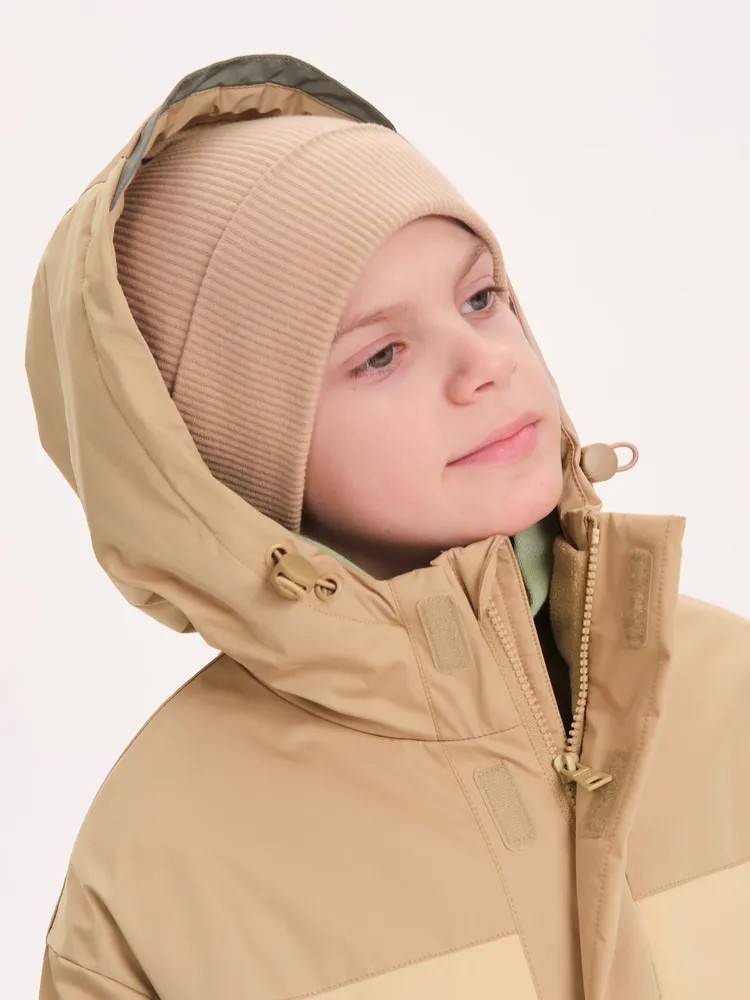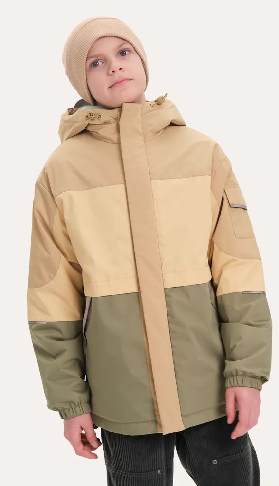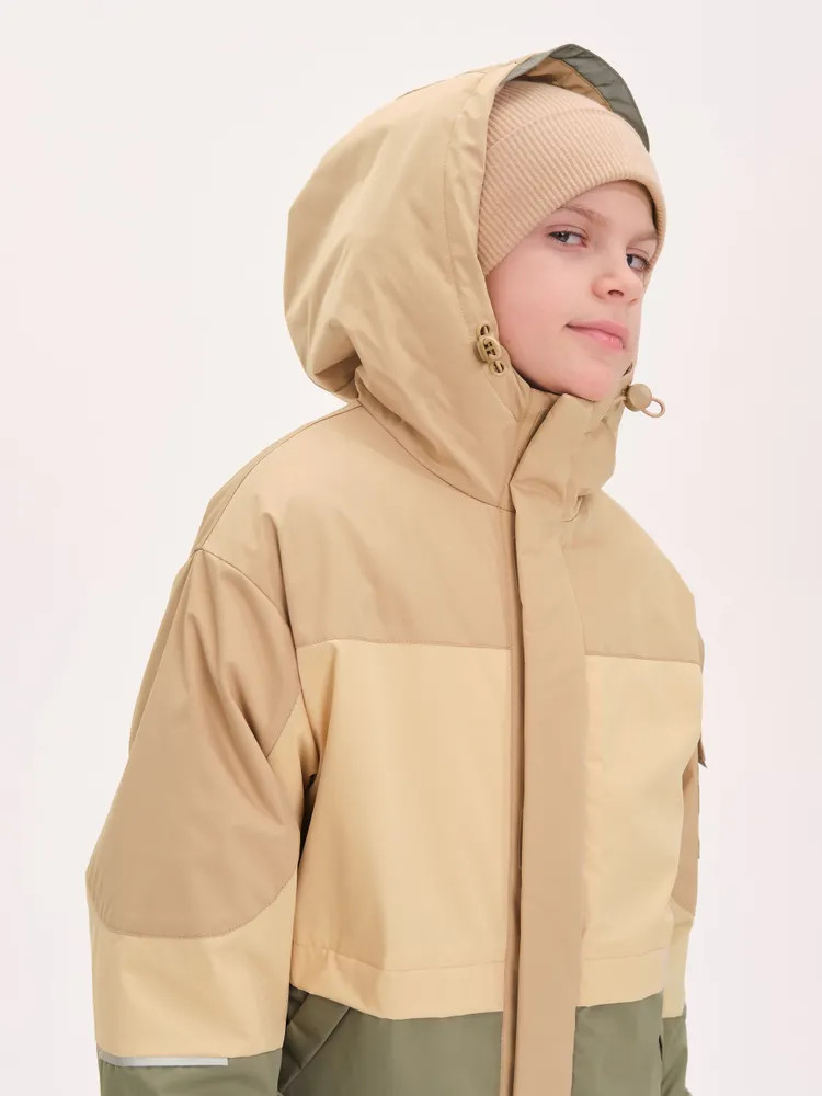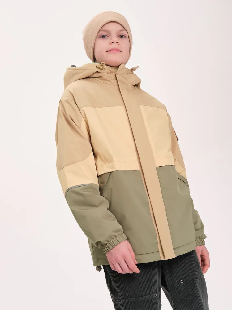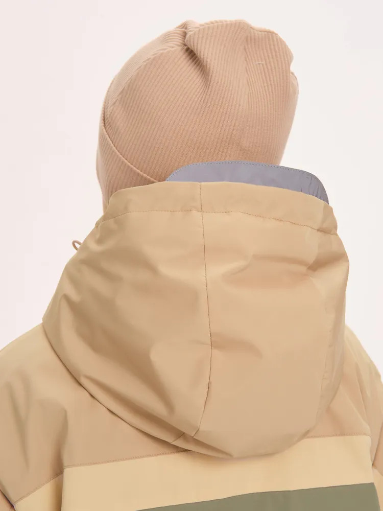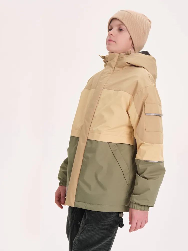 Ветровка с капюшоном. Двухшовный глубокий капюшон с козырьком из светоотражающего материала обеспечивает защиту от ветра и дождя и повышает безопасность в условиях низкой видимости. Прочная тракторная молния с защитой подбородка и удобным пуллером, что делает процесс застегивания максимально удобным для ребёнка. Под молнией ветрозащитная планка.