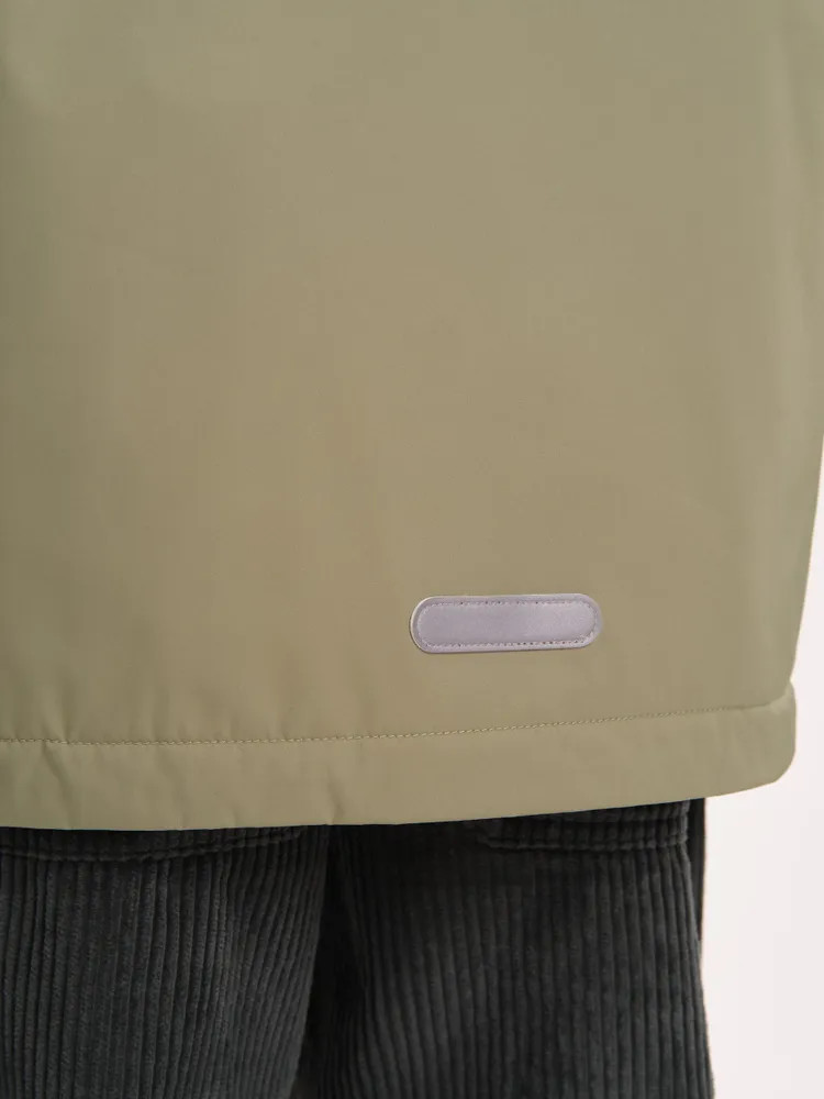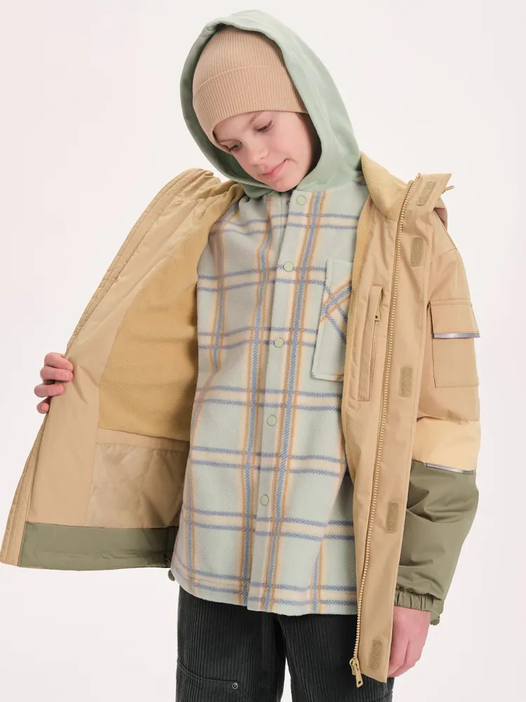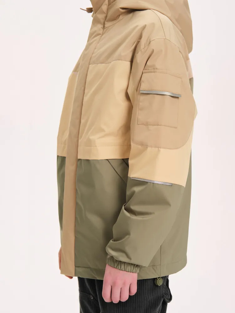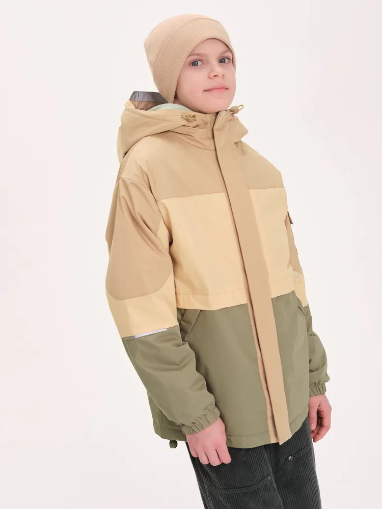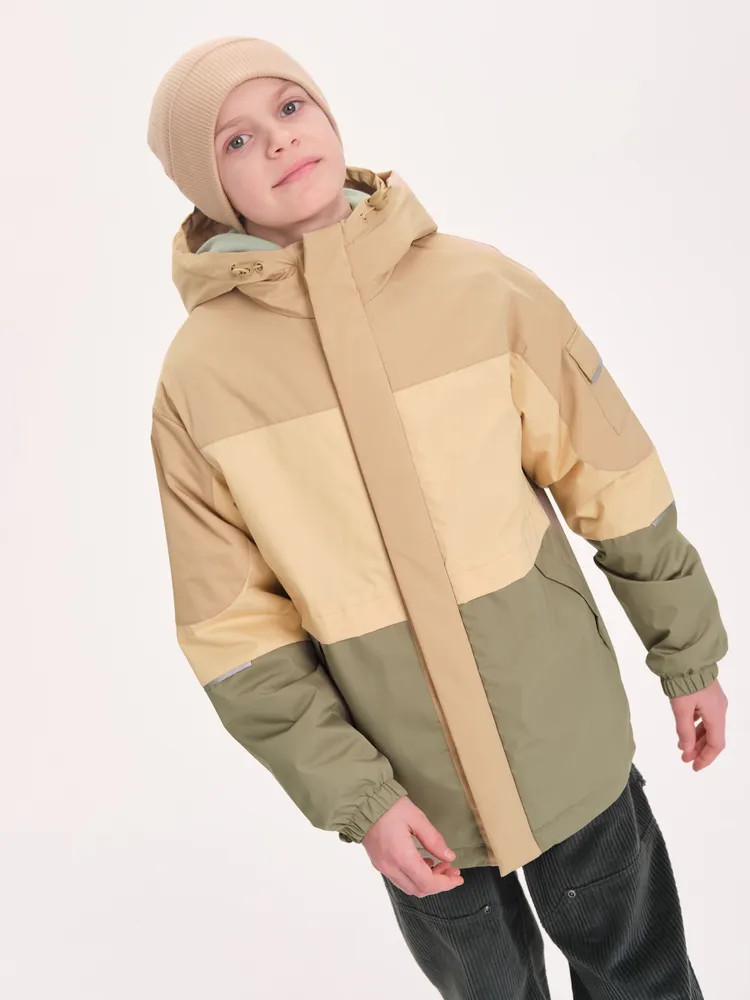 Ветровка с капюшоном. Двухшовный глубокий капюшон с козырьком из светоотражающего материала обеспечивает защиту от ветра и дождя и повышает безопасность в условиях низкой видимости. Прочная тракторная молния с защитой подбородка и удобным пуллером, что делает процесс застегивания максимально удобным для ребёнка. Под молнией ветрозащитная планка.