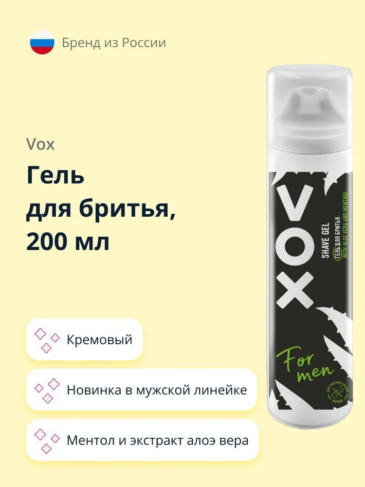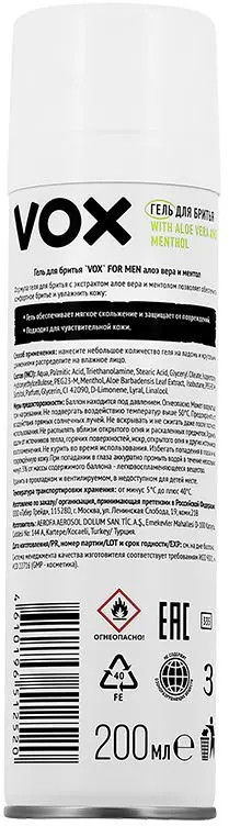 Формула геля для бритья Vox For Men с экстрактом алоэ вера и ментолом позволяет обеспечить комфортное бритье и увлажнить кожу. Гель создает мягкое скольжение и защищает от повреждений. Подходит для чувствительной кожи.