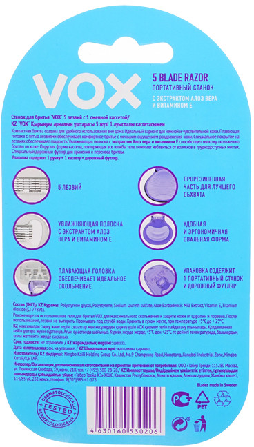 VOX Станок для бритья с экстрактом алоэ вера и витамином Е «Мини»В данный момент этот товар отсутствует в продаже. Возможно, у нас найдется аналогичный или похожий товар здесь. Серия: For Women Компактная бритва Vox с 5 лезвиями создана для удобного использования вне дома. Идеальный вариант для нежной и чувствительной кожи. Плавающая головка с пятью лезвиями обеспечивает комфортное бритье без раздражения кожи. Специальное покрытие на лезвиях обеспечивает экстрагладкость. Увлажняющая полоска с экстрактом алоэ вера и витамином Е способствует мягкому скольжению бритвы по коже. Округлая форма кассеты, повторяющая все изгибы тела, помогает избавиться от волосков в труднодоступных местах. Специальный дорожный футляр предназначен для хранения и переноса бритвы. Упаковка содержит 1 ручку, 1 кассету, 1 дорожный футляр. |