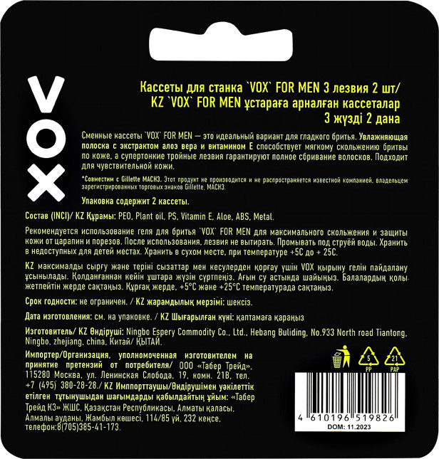 VOX Набор кассет сменных для бритвенного станкаВ данный момент этот товар отсутствует в продаже. Возможно, у нас найдется аналогичный или похожий товар здесь. Серия: For Men Сменные кассеты для станка Vox For Men — это идеальный вариант для гладкого бритья. Увлажняющая полоска с экстрактом алоэ вера и витамином Е способствует мягкому скольжению бритвы по коже, а супертонкие тройные лезвия гарантируют полное сбривание волосков. Подходит для чувствительной кожи. Совместим с Gillette Mach 3. Этот продукт не производится и не распространяется известной компанией, владельцем зарегистрированных торговых знаков Gillette, Venus, Fusion. Упаковка содержит 2 кассеты. |