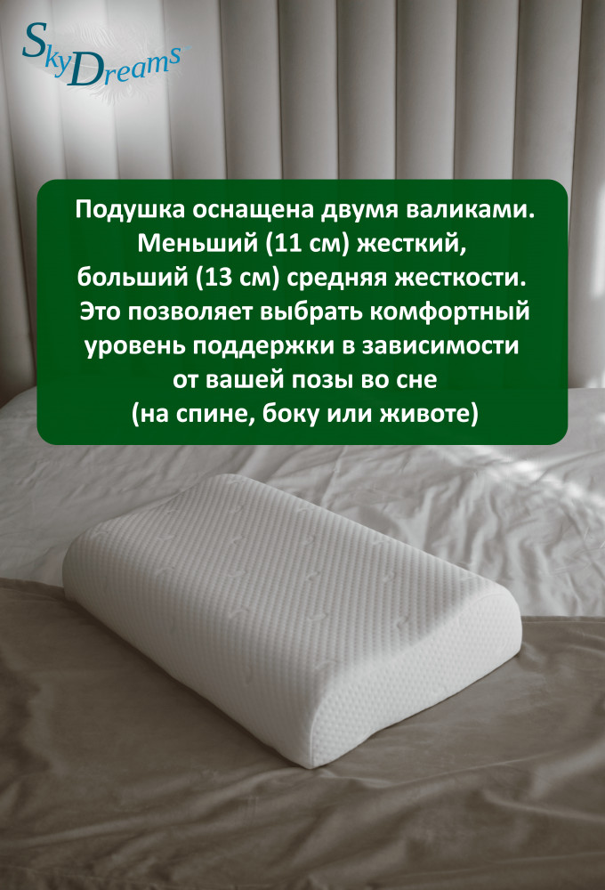• разные высоты валиков: подушка оснащена двумя валиками — меньший (11 см) жесткий, больший (13 см) — средняя жесткости. Это позволяет выбрать комфортный уровень поддержки в зависимости от вашей позы во сне (на спине, боку или животе);