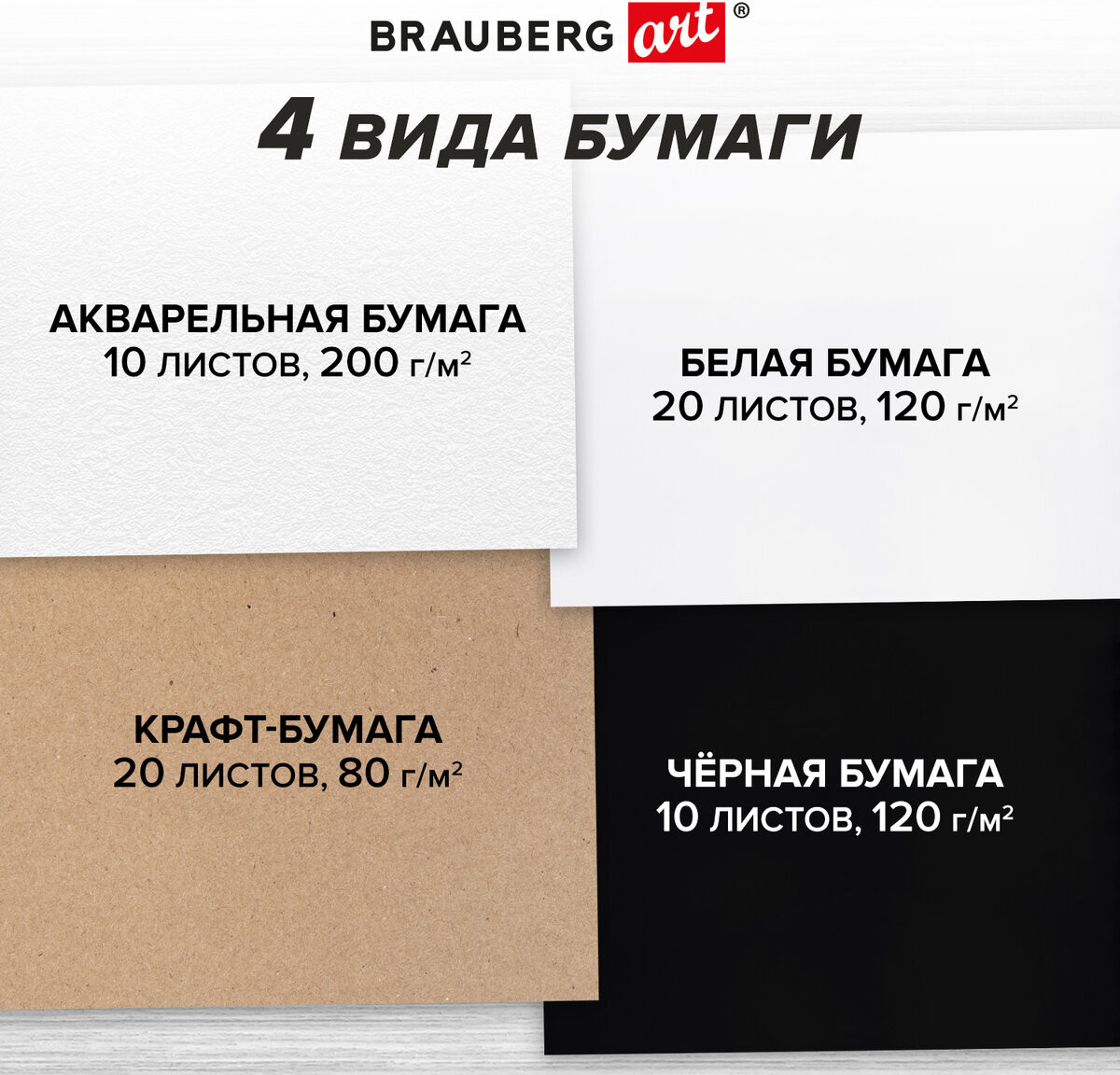 💳 Оплатить за товар можно при получении 🇰🇿 Есть бесплатная доставка по Казахстану от 1 дня 🎁 Копите бонусы с каждой покупки Серия: Art debut Скетчбуки Brauberg Art идеальны для графики и эскизов. Бумага прекрасно подойдет для рисования карандашами и другими сухими материалами. Также могут быть использованы для рисования линерами. Изделие имеет размер 146×204 мм и содержит 60 листов. Обложка с модным дизайном и жесткая задняя подложка позволяют делать зарисовки и наброски «на весу». Внутренний блок представлен сразу четырьмя видами бумаги: акварельная (10 листов плотностью 200 г/м²), белая (20 листов плотностью 120 г/м²), крафтовая (20 листов плотностью 80 г/м²) и черная (10 листов плотностью 120 г/м²). |