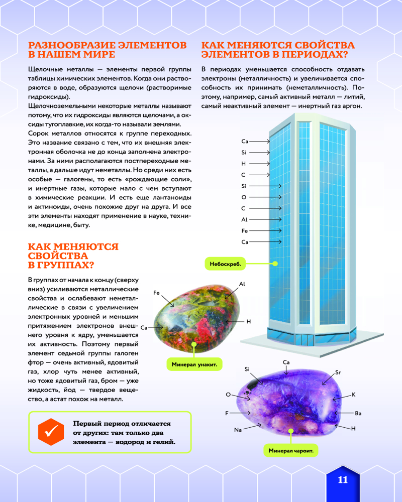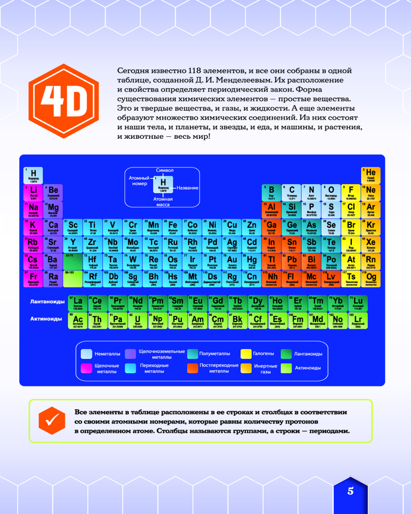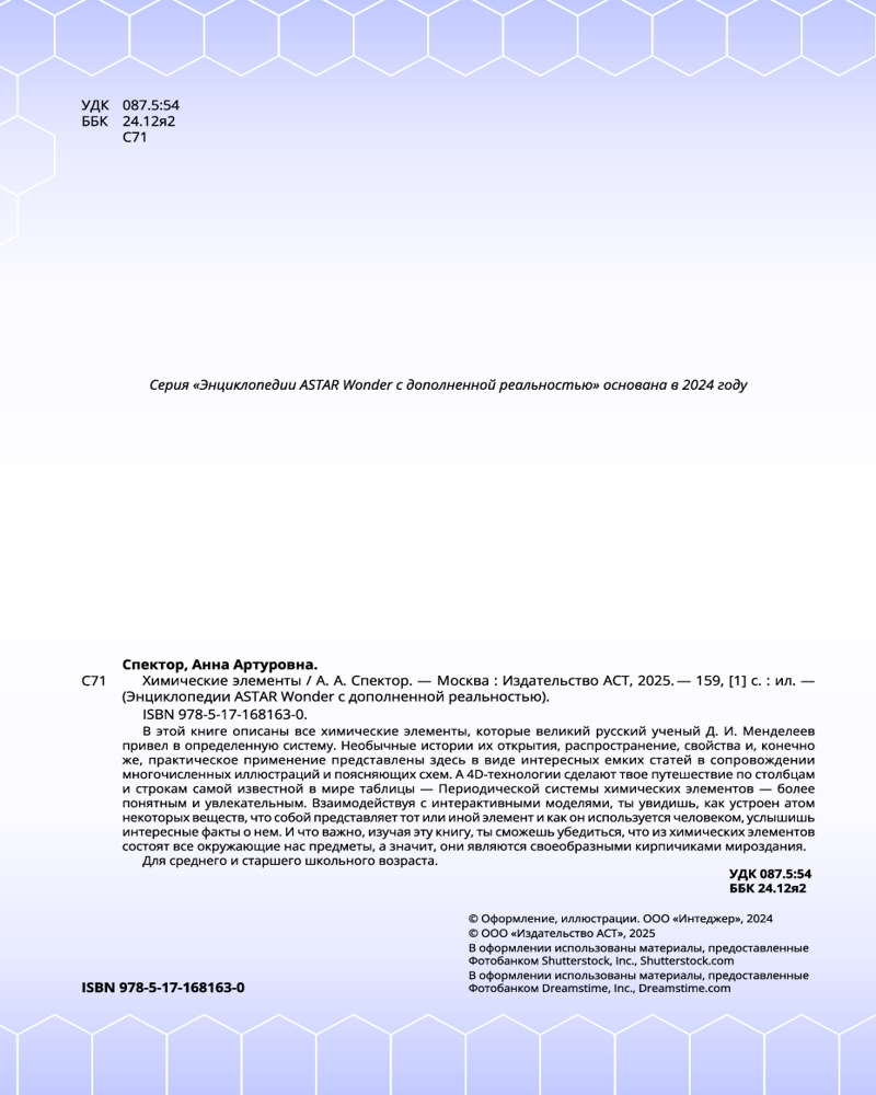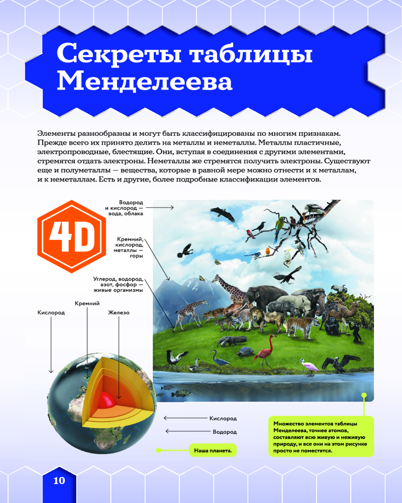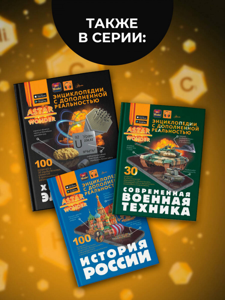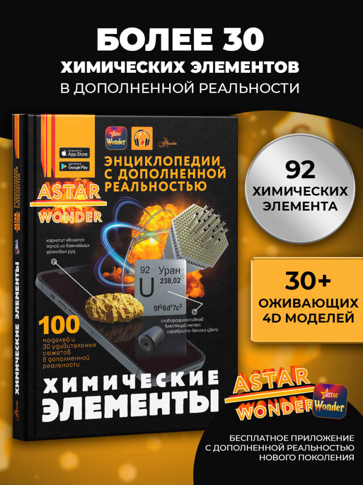 💳 Оплатить за товар можно при получении 🇰🇿 Есть бесплатная доставка по Казахстану от 1 дня 🎁 Копите бонусы с каждой покупки Серия: Энциклопедии ASTAR Wonder с дополненной реальностью В этой книге описаны все химические элементы, которые великий русский ученый Д. И. Менделеев привел в определенную систему. Необычные истории их открытия, распространение, свойства и, конечно же, практическое применение представлены здесь в виде интересных емких статей в сопровождении многочисленных иллюстраций и поясняющих схем. А 4D-технологии сделают твое путешествие по столбцам и строкам самой известной в мире таблицы — Периодической системы химических элементов — более понятным и увлекательным. Взаимодействуя с интерактивными моделями, ты увидишь, как устроен атом некоторых веществ, что собой представляет тот или иной элемент и как он используется человеком, услышишь интересные факты о нем. И что важно, изучая эту книгу, ты сможешь убедиться, что из химических элементов состоят все окружающие нас предметы, а значит, они являются своеобразными кирпичиками мироздания. |
