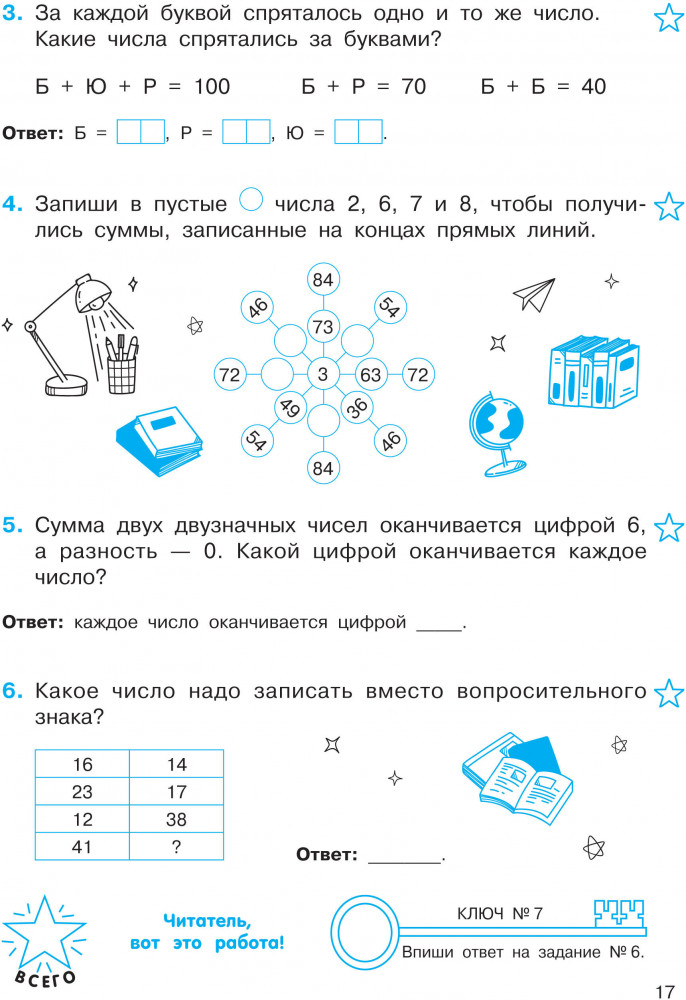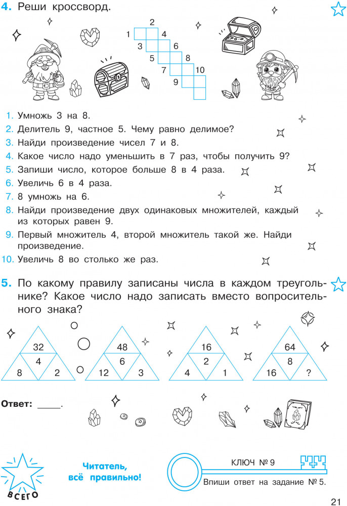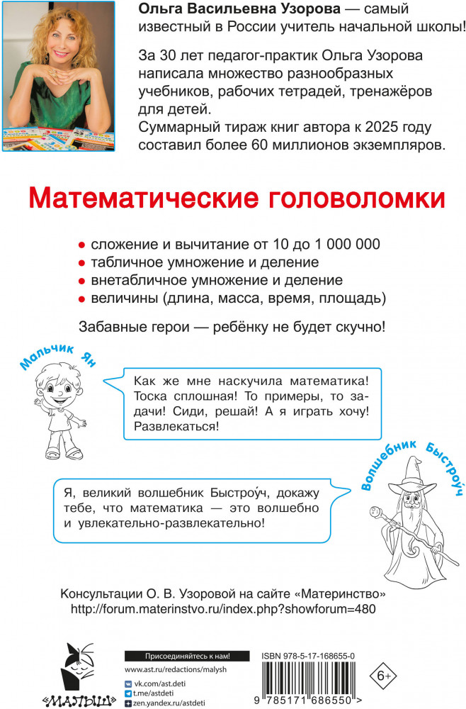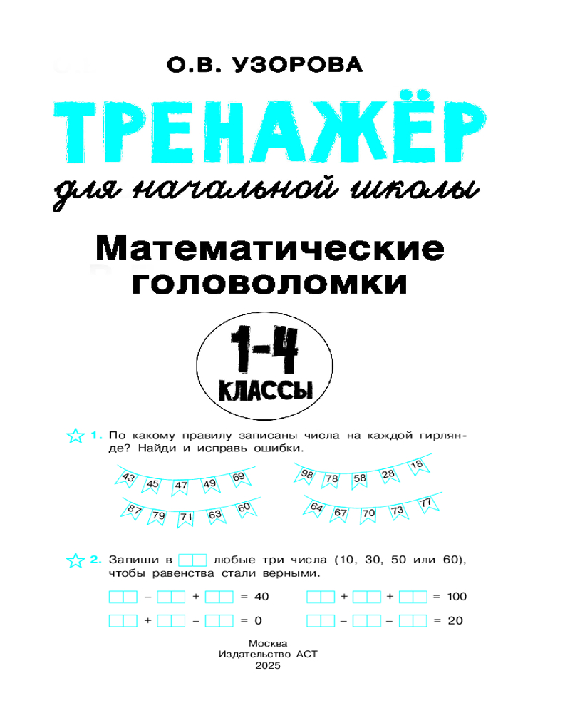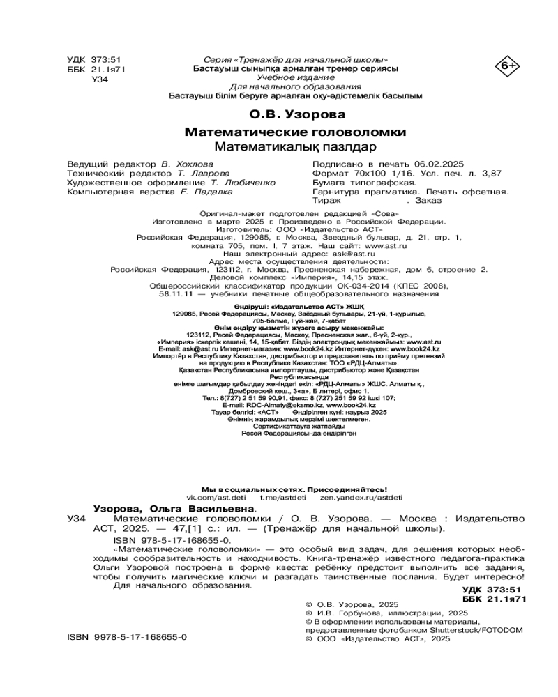 💳 Оплатить за товар можно при получении 🇰🇿 Есть бесплатная доставка по Казахстану от 1 дня 🎁 Копите бонусы с каждой покупки Серия: Тренажер для начальной школы Математические головоломки — это особый вид задач, для решения которых необходимы сообразительность и находчивость. Книга-тренажёр известного педагога-практика Ольги Узоровой построена в форме квеста: ребёнку предстоит выполнить все задания, чтобы получить магические ключи и разгадать таинственные послания. Будет интересно! |