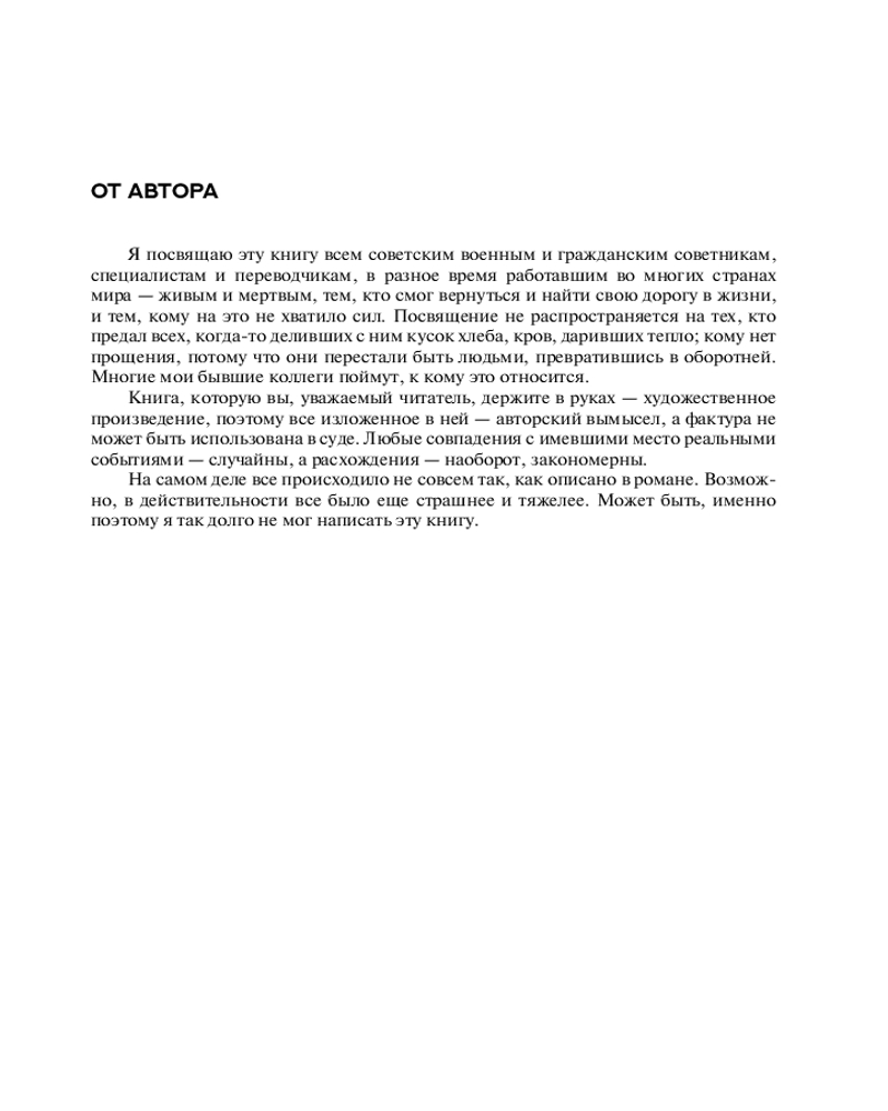 Я посвящаю эту книгу всем советским военным и гражданским советникам, специалистам и переводчикам, в разное время работавшим во многих странах мира — живым и мертвым, тем, кто смог вернуться и найти свою дорогу в жизни, и тем, кому на это не хватило сил. Посвящение не распространяется на тех, кто предал всех, когда-то деливших с ним кусок хлеба, кров, даривших тепло; кому нет прощения, потому что они перестали быть людьми, превратившись в оборотней. Многие мои бывшие коллеги поймут, к кому это относится.