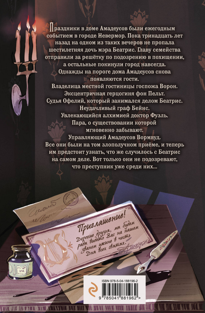 💳 Оплатить за товар можно при получении 🇰🇿 Есть бесплатная доставка по Казахстану от 1 дня 🎁 Копите бонусы с каждой покупки Серия: Дом волшебных историй В канун Дня всех святых жителей городка Невермор потрясло известие об исчезновении шестилетней Беатрис Уиллоби, дочери мэра. Морта Амадеуса, хозяина дома, из которого пропала девочка, обвинили в её похищении и посадили в тюрьму. С тех пор о семье Амадеусов никто не слышал. |