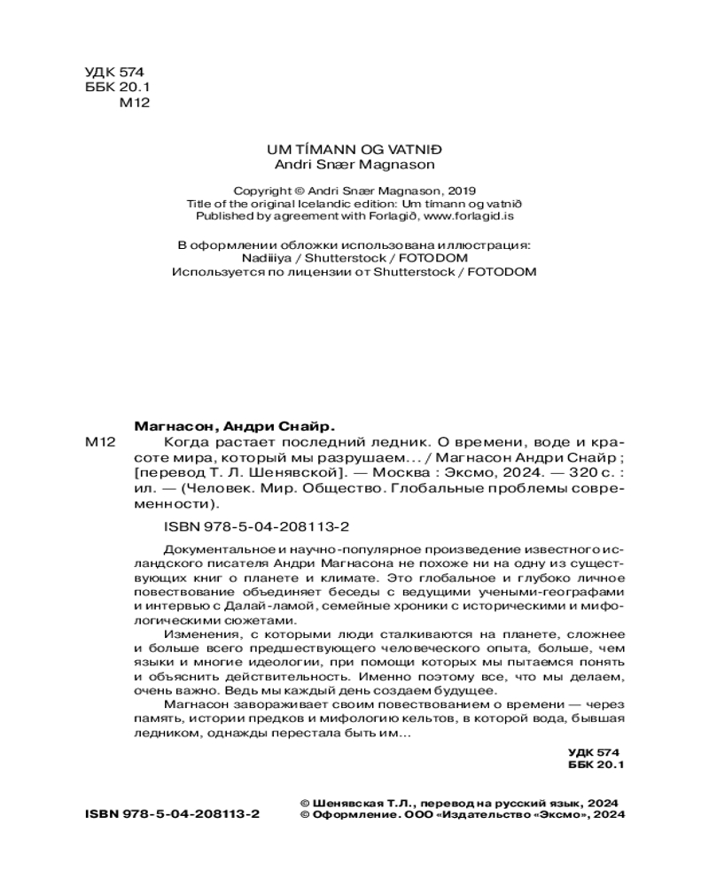 💳 Оплатить за товар можно при получении 🇰🇿 Есть бесплатная доставка по Казахстану от 1 дня 🎁 Копите бонусы с каждой покупки Серия: Другой планеты нет. Книги о глобальных проблемах человечества Уникальное глубоко личное и одновременно глобальное повествование популярного исландского писателя Андри Магнасона — это история путешествия и всемирная история. От размышлений о том, как писать некролог айсбергу, автор переходит к призыву глубже понимать время — прошедшее и наступившее, помнить о наших обязательствах друг перед другом, перед предками и внуками. Ставшая бестселлером в Исландии и опубликованная в двух десятках стран, книга основана на беседах с ведущими учеными, занимающимися ледниками, океанами, климатом и географией. Рассказы из семейной хроники переплетены у Магнасона с историческими и мифологическими сюжетами. Его документальная проза иллюстрирует реальность изменения климата и дает надежду перед лицом неопределенного будущего. |