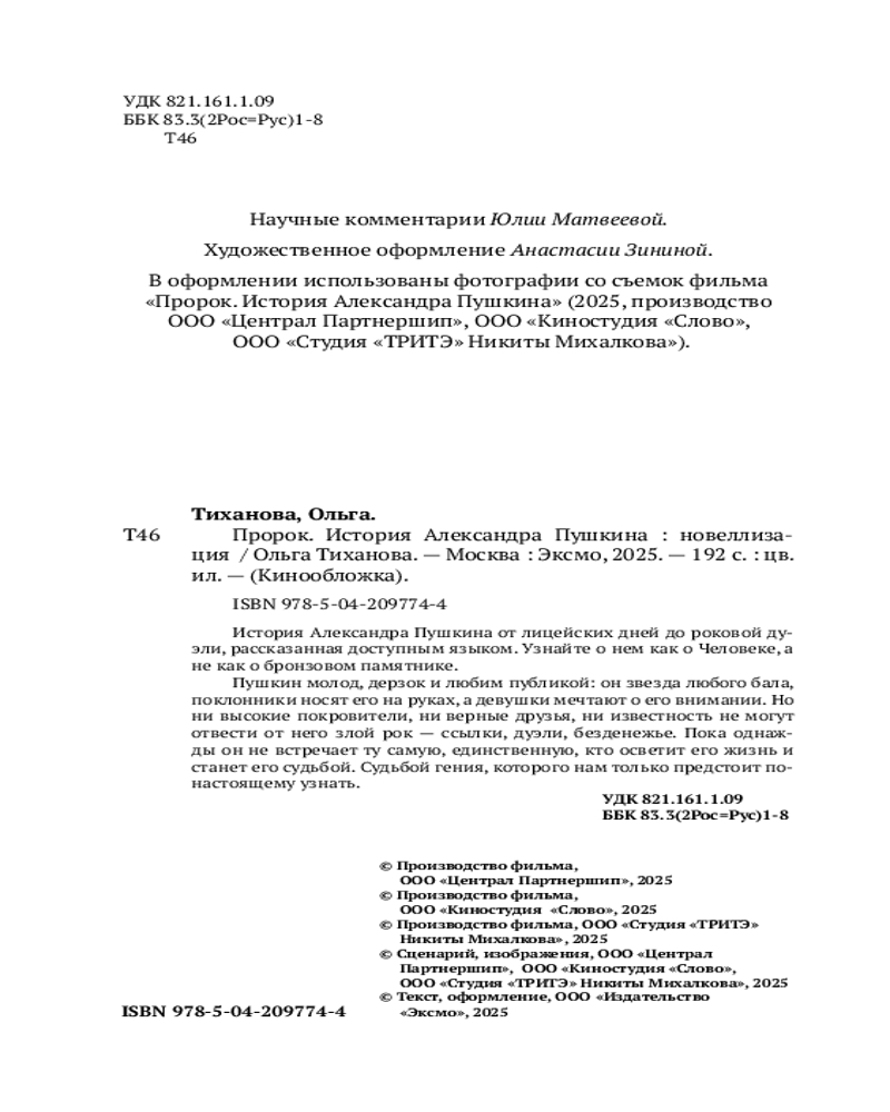 Серия: Кинообложка Официальная новеллизация одного из самых ожидаемых кинопроектов зимы 2025 года — «Пророк. История Александра Пушкина» от команды «Централ Партнершип».