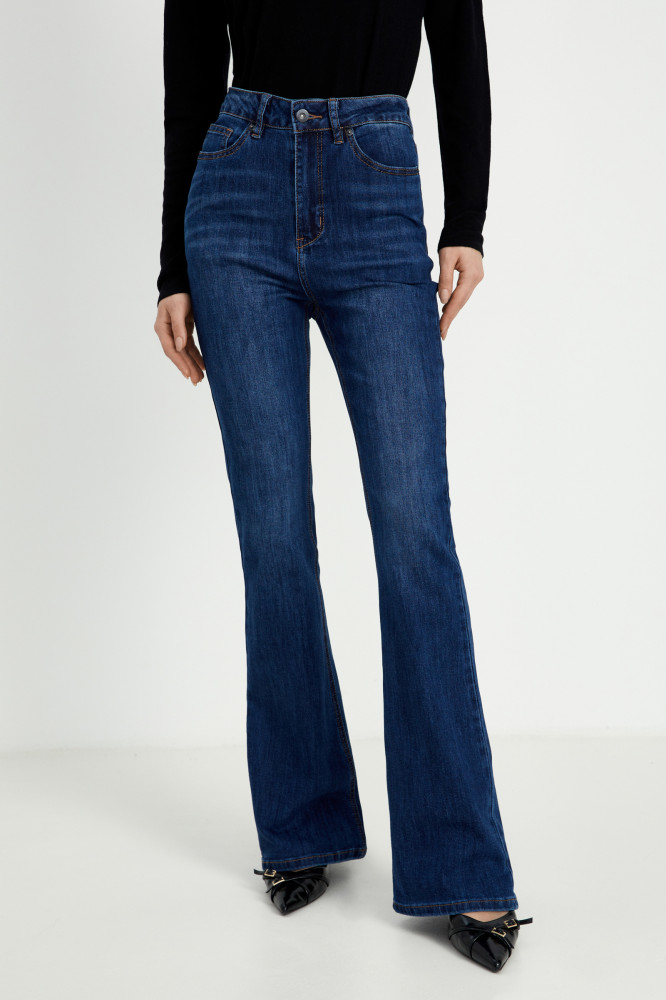 Базовые женские джинсы bootcut из смесового хлопка. Плотная ткань хорошо держит форму, пропускает воздух и не электризуется. Небольшой процент эластана обеспечивает комфортную посадку. Расклешенная модель дополнена карманами и мягким поясом со шлевками. Высокая посадка, застежка на молнию и пуговицу.