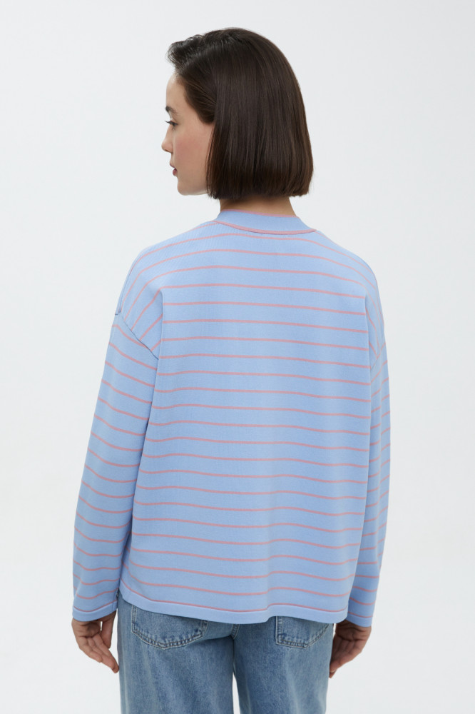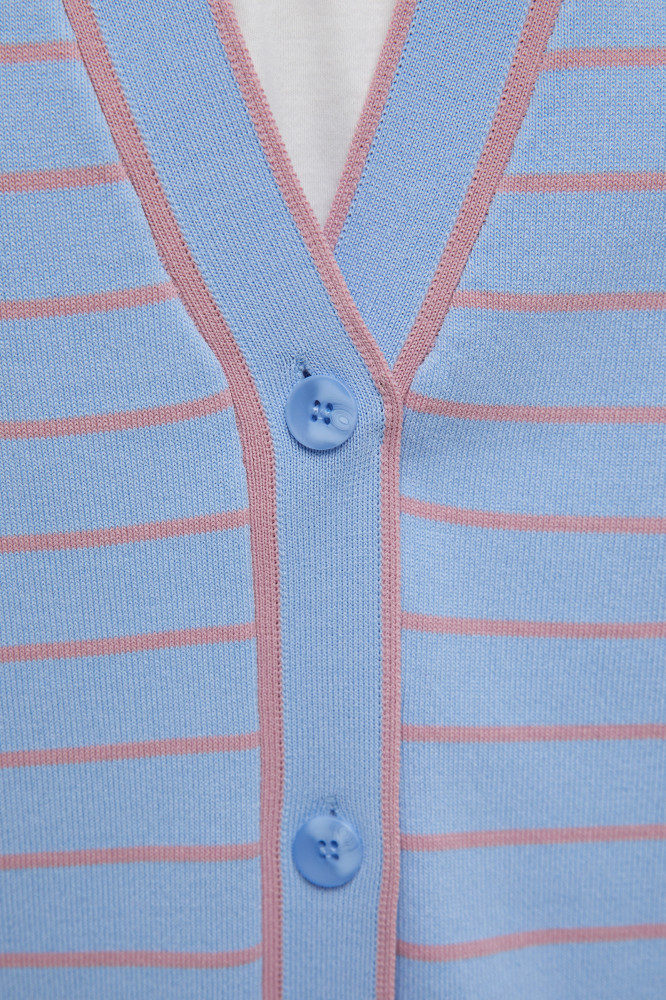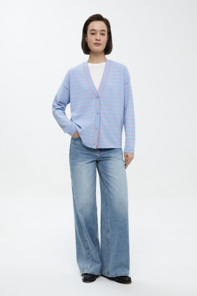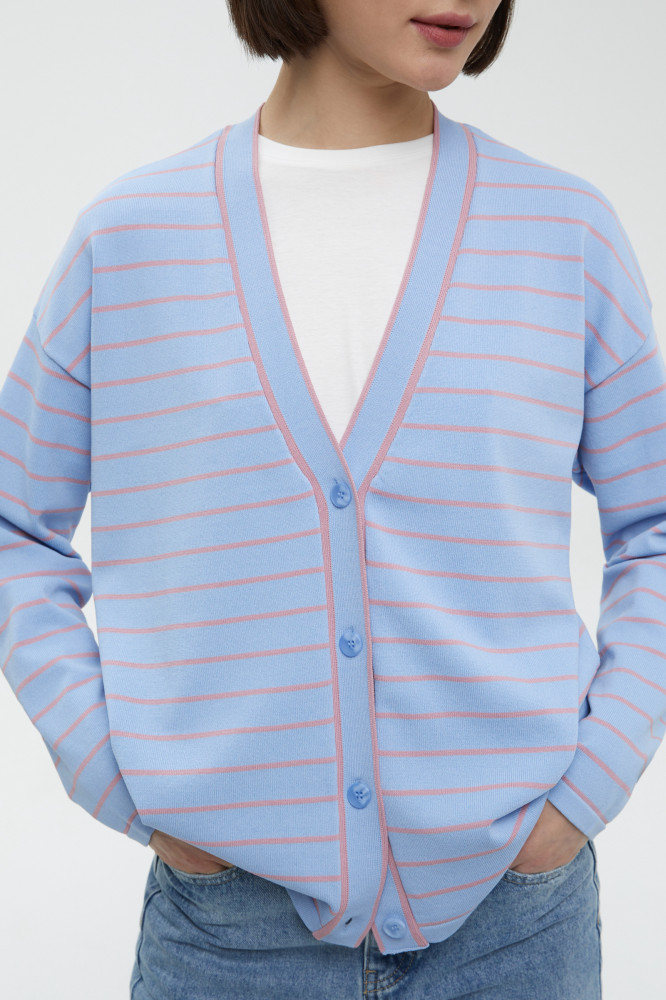 Свободный кардиган в полоску. Актуальный принт и универсальный крой идеально подойдут для любого образа. Качественный смесовый состав обеспечивает мягкость и воздухопроницаемость ткани. V-образный вырез создает изящный силуэт и визуально вытягивает овал лица. Кардиган застегивается на элегантные пуговицы. Эластичный пояс и мягкие манжеты гарантируют максимальный комфорт и удобную посадку.
