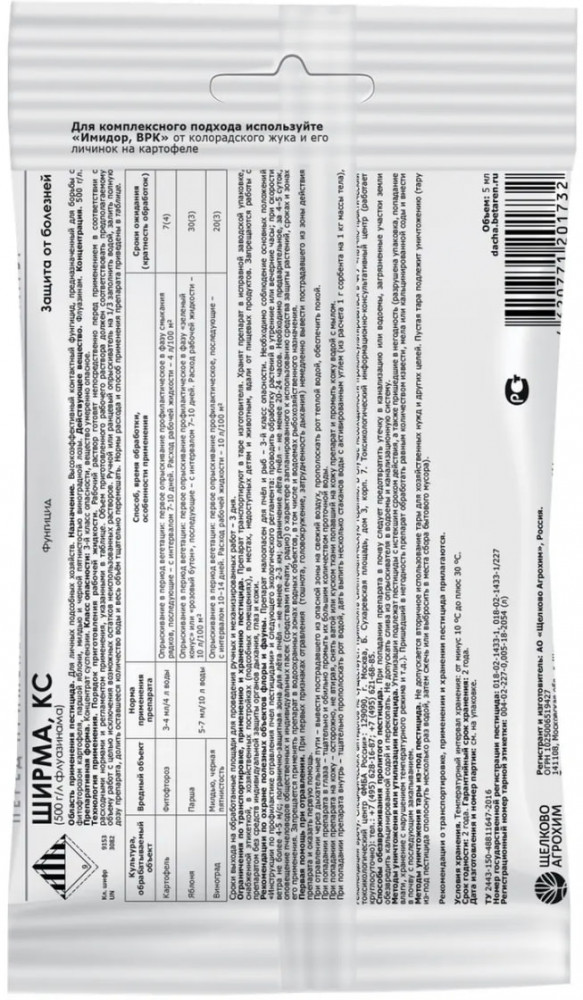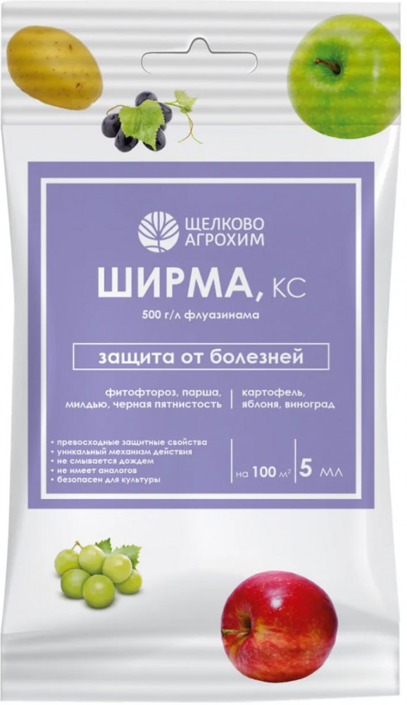 Русский Огород Средство от болезней «Ширма»В данный момент этот товар отсутствует в продаже. Возможно, у нас найдется аналогичный или похожий товар здесь. Ширма — контактный фунгицид для защиты плодово-ягодных и овощных культур от болезней. Обеспечивает надежную защиту листьев и плодов, предотвращая распространение инфекции и снижая риск резистентности возбудителей. Устойчив к смыванию осадками, что гарантирует длительное действие даже при частых дождях и поливе. |