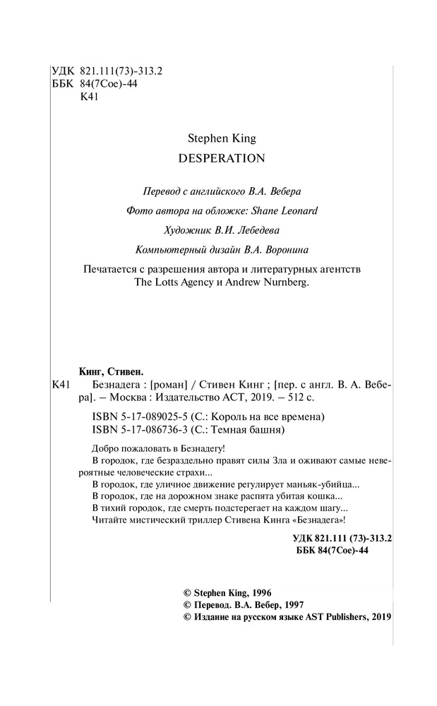 В данный момент этот товар отсутствует в продаже. Возможно, у нас найдется аналогичный или похожий товар здесь. Серия: Темная Башня Добро пожаловать в Безнадегу! В городок, где безраздельно правят силы Зла и оживают самые невероятные человеческие страхи… В городок, где уличное движение регулирует маньяк-убийца… В городок, где на дорожном знаке распята убитая кошка…