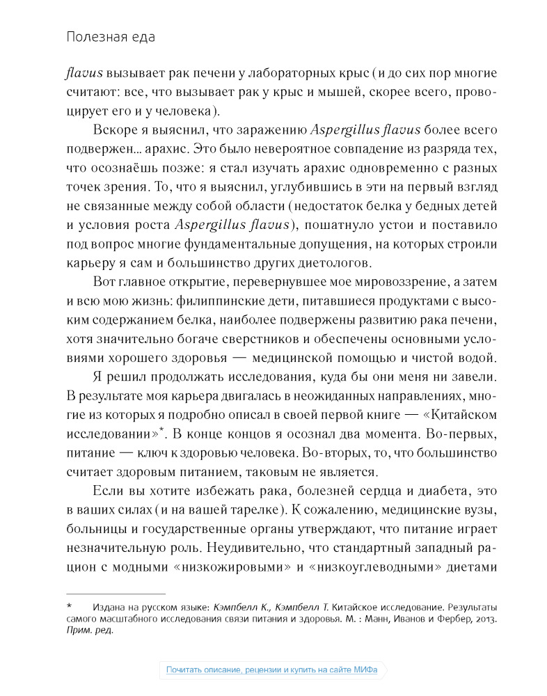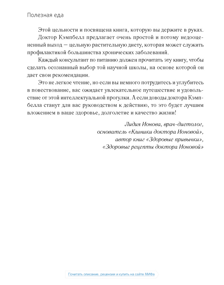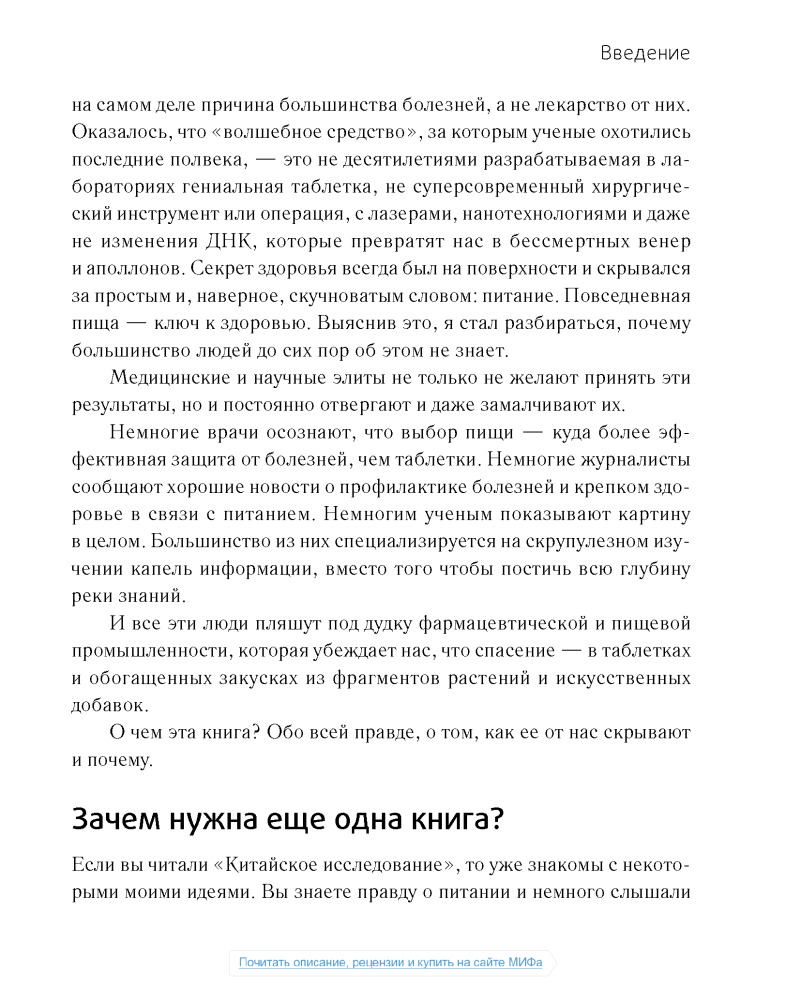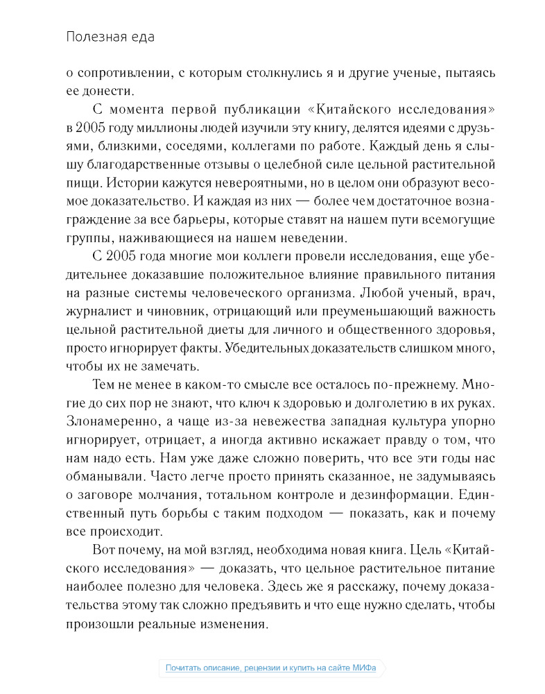 Сразу скажу, что не дочитал данный труд до конца. Лично мне не нравится как автор пишет. Неинтересно. Главная задача данной книги, как я понимаю, это убедить читателя в том, что животные продукты вредны. Автор всячески пытается привести аргументы в пользу растительной еды, описывая заговоры американских верхушек, лобби фармацевтов и т.д. Но! В книге практически отсутствует информация о том, что НУЖНО есть, нет советов относительно того, что и как и в каких количествах. Более того, все доводы автора о вреде животных продуктов основаны на исследованиях, проводимых на мышах и крысах по большей части и не кажутся мне столь уж убедительными. В общем, если вы ищете книгу о полезной еде, это не так книга, которая вам нужна.