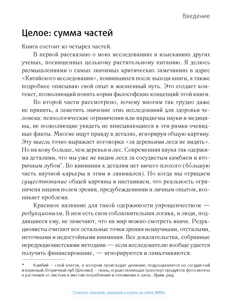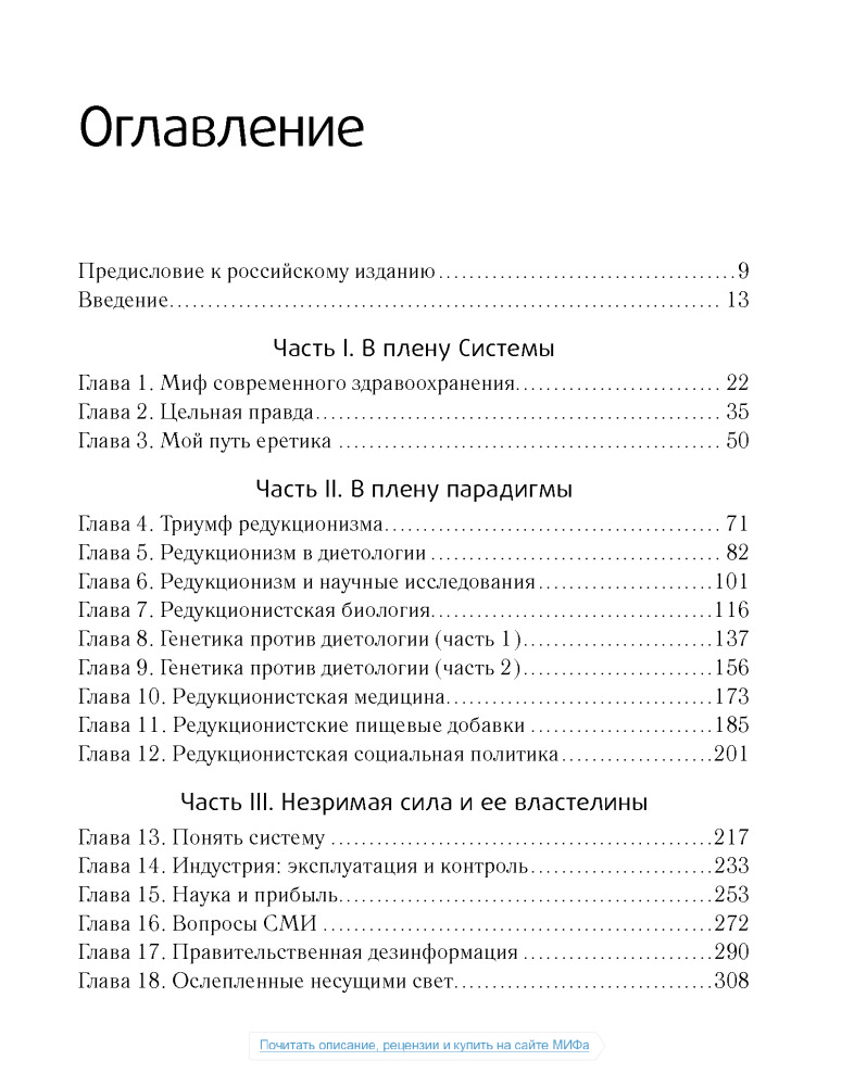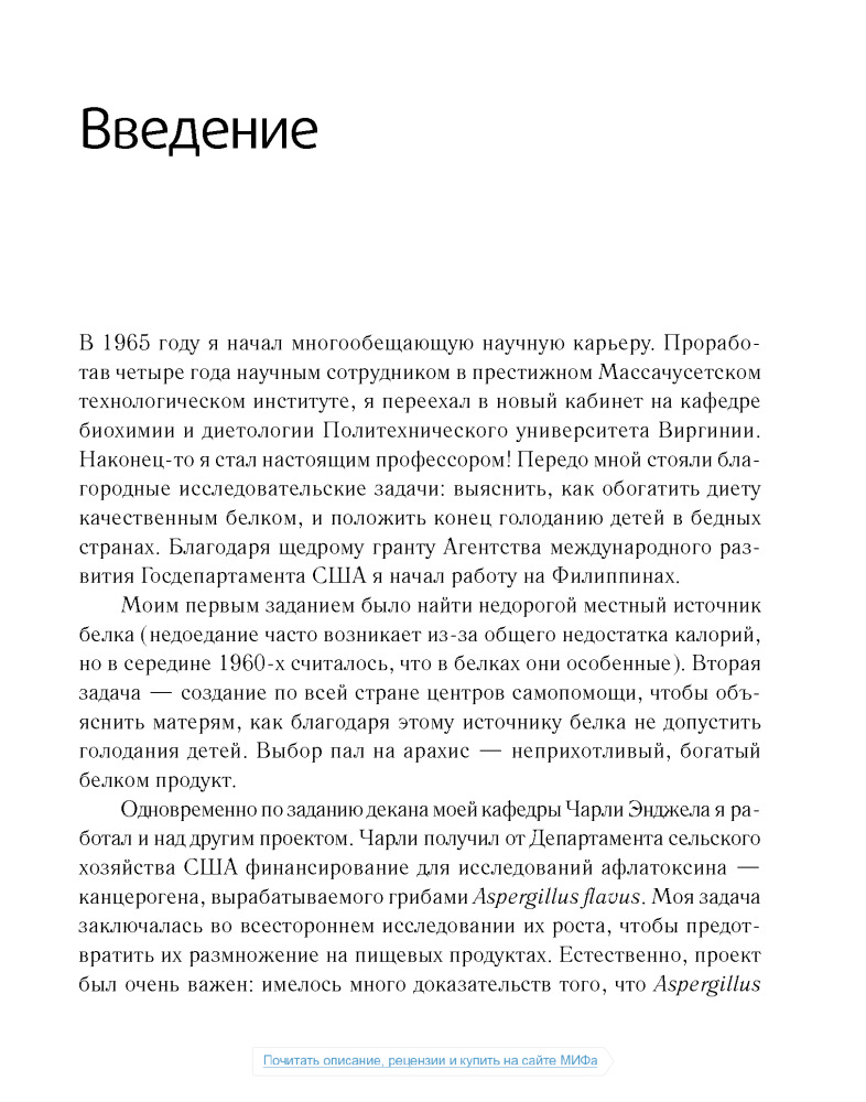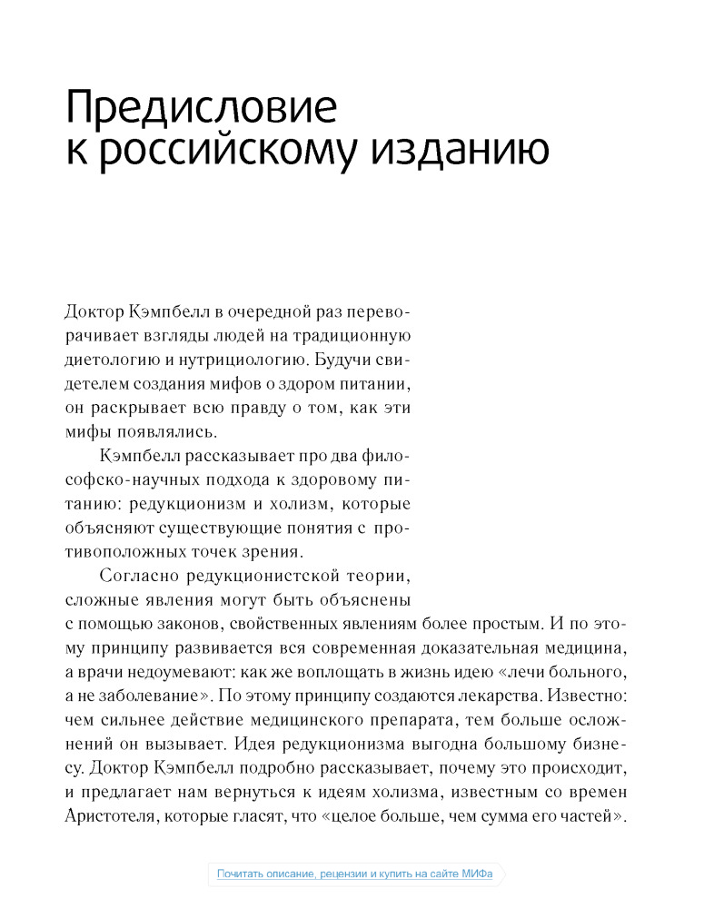 Сразу скажу, что не дочитал данный труд до конца. Лично мне не нравится как автор пишет. Неинтересно. Главная задача данной книги, как я понимаю, это убедить читателя в том, что животные продукты вредны. Автор всячески пытается привести аргументы в пользу растительной еды, описывая заговоры американских верхушек, лобби фармацевтов и т.д. Но! В книге практически отсутствует информация о том, что НУЖНО есть, нет советов относительно того, что и как и в каких количествах. Более того, все доводы автора о вреде животных продуктов основаны на исследованиях, проводимых на мышах и крысах по большей части и не кажутся мне столь уж убедительными. В общем, если вы ищете книгу о полезной еде, это не так книга, которая вам нужна.
