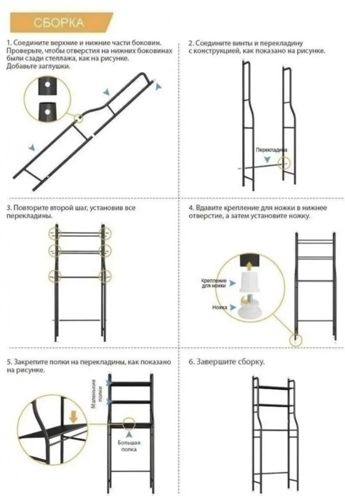Изделие легкое и удобное в сборке — достаточно соединить стойки и полки, вставить ножки и заглушки. В комплекте предусмотрены пластиковые заглушки для защиты пола от царапин, а также крепления к стене для надежной установки. Компактный, но вместительный, стеллаж поможет эффективно организовать пространство и сделать ванную комнату более функциональной.