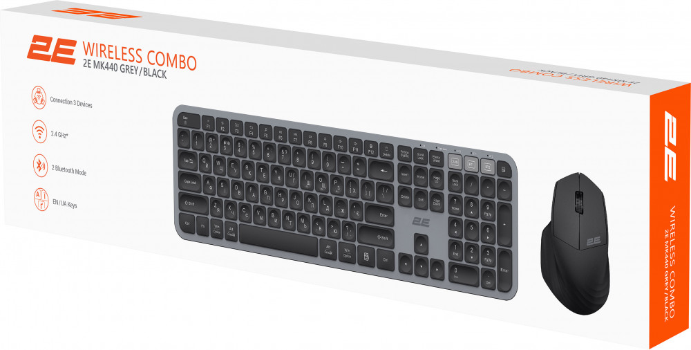 В данный момент этот товар отсутствует в продаже. Возможно, у нас найдется аналогичный или похожий товар здесь. Аккуратное, минималистское, настоящее произведение периферийного искусства — все это о беспроводном комплекте 2E MK440. Трехзонная полноразмерная клавиатура имеет вогнутые клавиши для более удобного использования. Наличие трех режимов подключения как у клавиатуры, так и у мыши — USB-адаптер и два Bluetooth — обуславливает возможность подключения одновременно к трем устройствам.