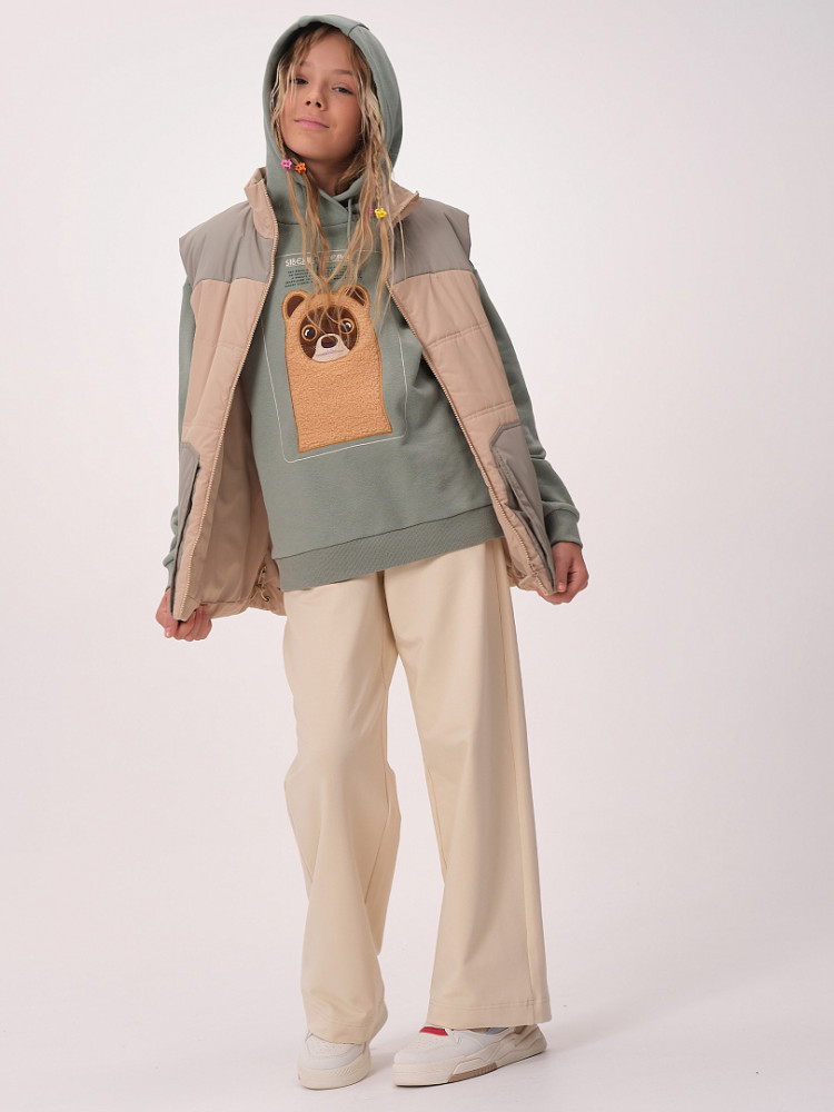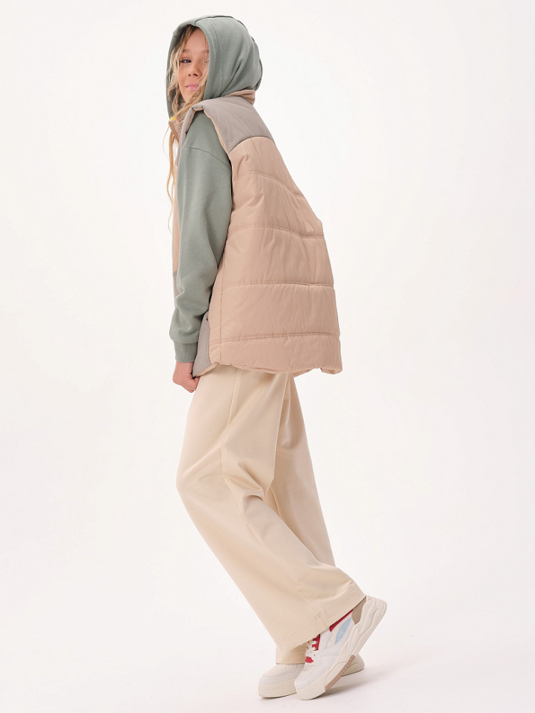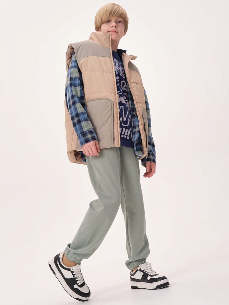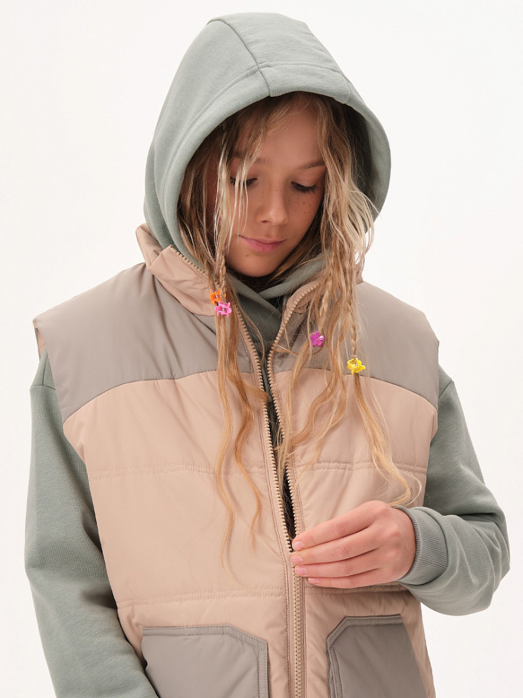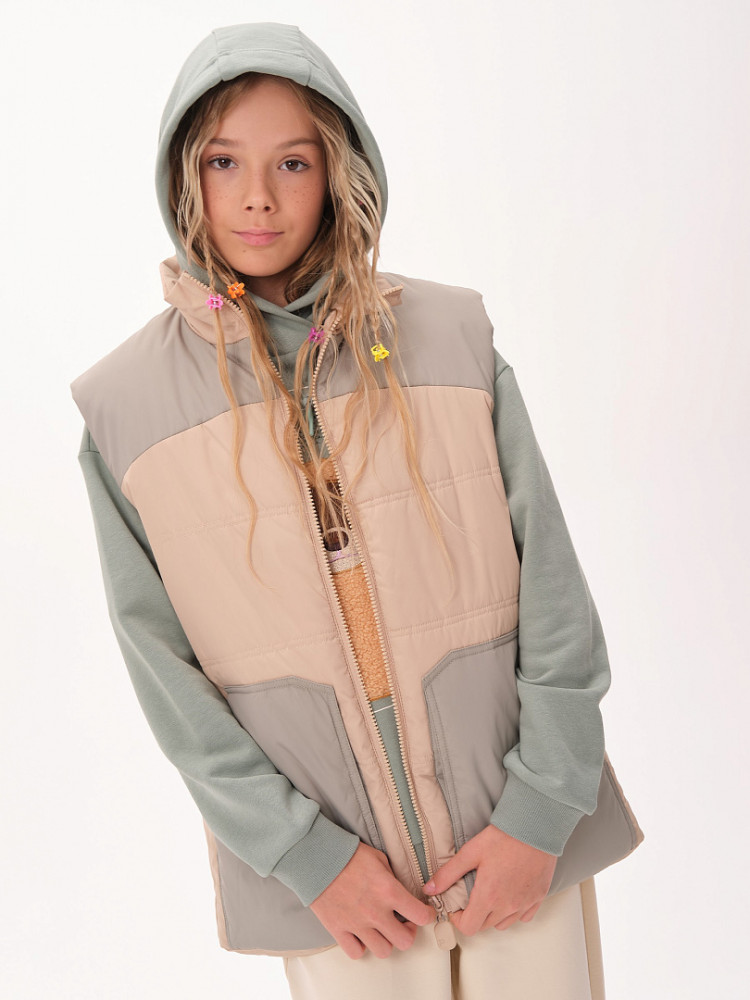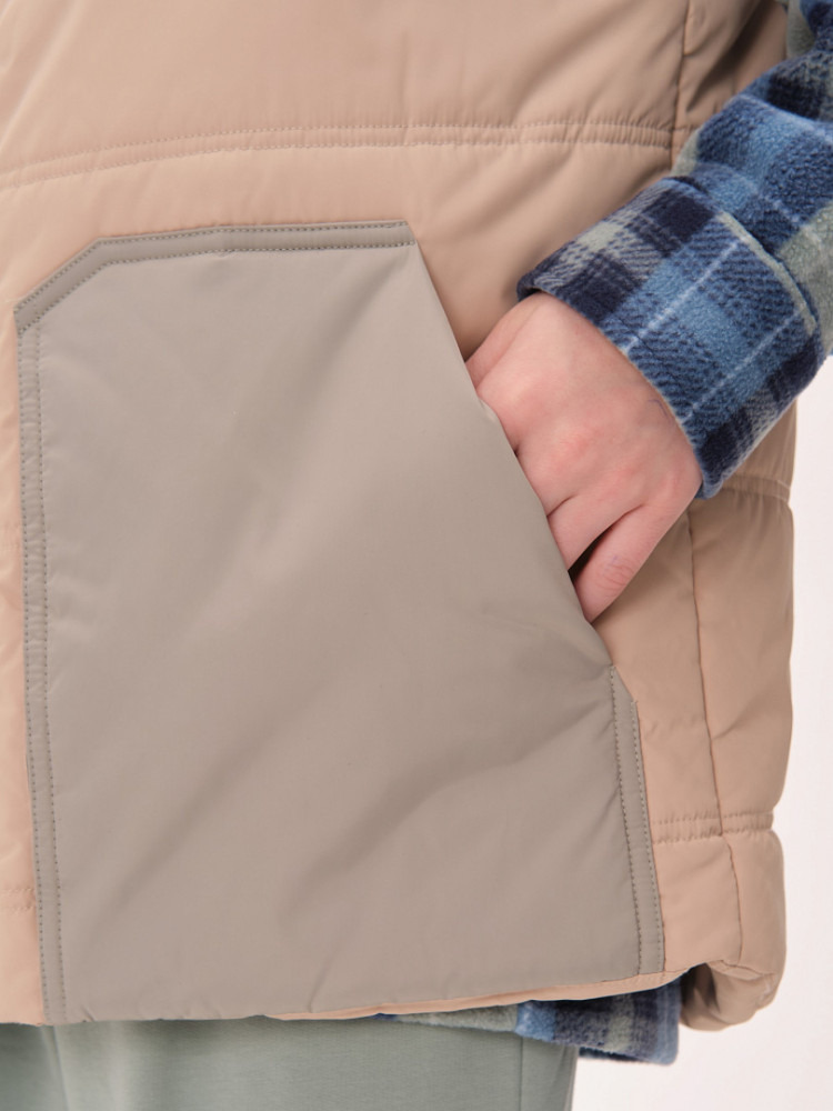 Жилет детский утеплённый — это не только тепло и комфорт, но и стильный образ для вашего ребёнка! Этот жилет подходит как мальчикам, так и девочкам. Он сочетает в себе практичность, удобство и модный дизайн. Жилет станет отличным выбором для активного отдыха на свежем воздухе в любое время года! Благодаря уникальному прямому силуэту и свободному объёму жилет обеспечивает максимальную свободу движений для вашего ребёнка. Дети смогут играть, прыгать и бегать на улице, не чувствуя дискомфорта. Жилет украшен фигурными кокетками на переде и спинке, что придаёт ему особый шарм и оригинальность. Ваш ребёнок будет выглядеть модно и уверенно, а вы сможете легко сочетать жилет с различной одеждой — от футболок до худи. Жилет утеплён синтепоном, который обеспечивает отличное тепло без лишнего веса. Ребёнок будет чувствовать себя комфортно даже в прохладные дни и не замёрзнет во время прогулок. Он имеет глубокие накладные карманы фигурной формы, которые идеально подходят для хранения мелочей. Воротник-стойка из синтепона дополнительно защищает шею от холодного ветра. Пройма и низ жилета укреплены обтачкой на «ребро» для прочности и долговечности. С внутренней стороны по низу жилета предусмотрена регулировка с помощью эластичного шнура. Это позволяет подгонять жилет под фигуру, обеспечивая дополнительную защиту от ветра и идеальную посадку.