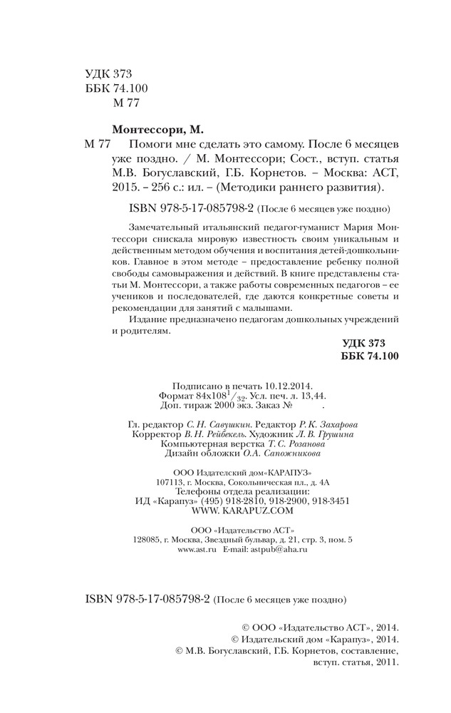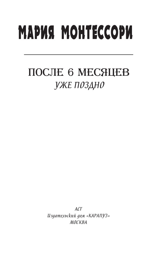Мария Монтессори. После 6 месяцев уже поздно. Уникальная методика раннего развитияВ данный момент этот товар отсутствует в продаже. Возможно, у нас найдется аналогичный или похожий товар здесь. Серия: Методики раннего развития Замечательный итальянский педагогмуманист Мария Монтессори снискала мировую известность своим уникальным и действенным методом обучения и воспитания детей-дошкольников. Главное в этом методе - предоставление ребенку полной свободы самовыражения и действий. В книге представлены статьи М. Монтессори, а также работы современных педагогов - ее учеников и последователей, где даются конкретные советы и рекомендации для занятий с малышами. |
