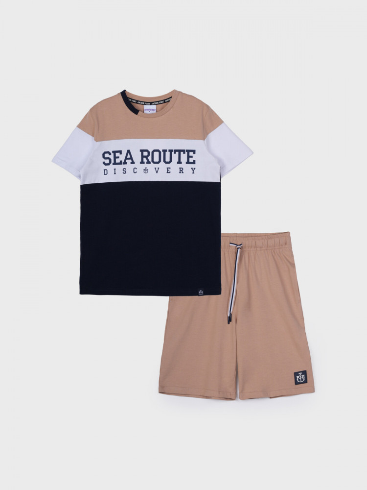 Костюм для мальчика-подростка. Футболка и шорты из эластичного и приятного на ощупь трикотажа. Шорты на резинке со шнурком, с карманами в боковых швах. Высокое содержание хлопка — 95%. Благодаря наличию эластана в составе ткани изделие держит форму и меньше мнется. Модель выполнена из качественного и приятного на ощупь трикотажа.