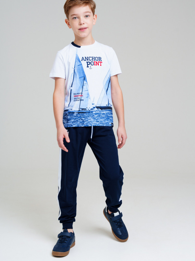 Костюм для мальчика-подростка. Футболка и штаны из эластичного и приятного на ощупь трикотажа. Штаны на резинке со шнурком, с карманами в боковых швах. Эластичные манжеты по низу брючин. Высокое содержание хлопка — 95%. Благодаря наличию эластана в составе ткани изделие держит форму и меньше мнется. Модель выполнена из качественного и приятного на ощупь трикотажа.