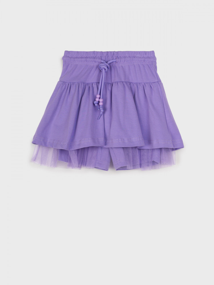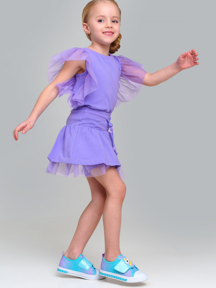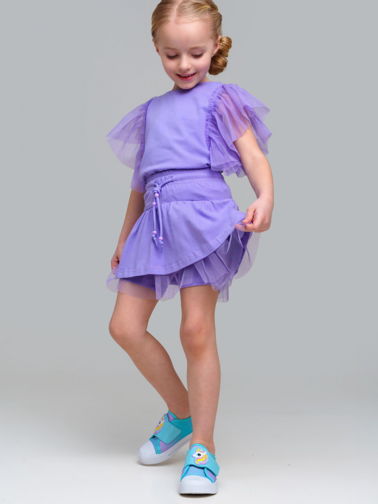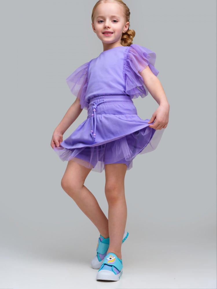 Юбка-шорты детские для девочки. Шорты из качественного и приятного на ощупь трикотажа джерси. На резинке со шнурком. Высокое содержание хлопка 95%. Благодаря наличию эластана в составе ткани изделие держит форму и меньше мнется. Декор из сетки. Модель выполнена из качественного и приятного на ощупь трикотажа.