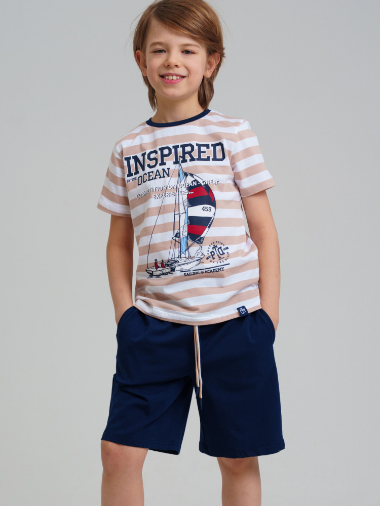 Костюм для мальчика-подростка. Футболка и шорты из эластичного и приятного на ощупь трикотажа. Шорты на резинке со шнурком, с карманами в боковых швах. Высокое содержание хлопка — 95%. Благодаря наличию эластана в составе ткани изделие держит форму и меньше мнется. Модель выполнена из качественного и приятного на ощупь трикотажа.