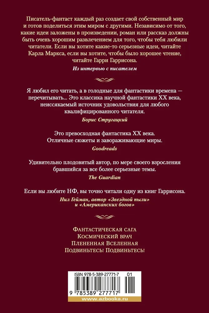 💳 Оплатить за товар можно при получении 🇰🇿 Есть бесплатная доставка по Казахстану от 1 дня 🎁 Копите бонусы с каждой покупки Серия: Фантастика и фэнтези. Большие книги Гарри Гаррисон (Генри Максвелл Демпси) — один из творцов классического «ядра» мировой фантастики, создатель бессмертных циклов о Язоне динАльте и Джиме ди Гризе по прозвищу Стальная Крыса, автор культовых романов «Подвиньтесь! Подвиньтесь!» и «Фантастическая сага», грандмастер премии «Небьюла», рыцарь ордена святого Фантония и вообще человек, имевший привычку оставлять яркий след на любом поприще — от иллюстраторского мастерства до продвижения эсперанто. В настоящий сборник вошли лучшие «сольные» романы автора, отражающие самые разные грани таланта этого замечательного фантаста. Тема путешествий во времени представлена знаменитой «Фантастической сагой» — романом о том, как ушлые киношники Голливуда вытаскивают из прошлого викинга и заставляют его открыть Америку. В «Космическом враче» и «Плененной Вселенной» главный герой, наряду с действующими в романах персонажами, — Космос. В фантастическом детективе «Подвиньтесь! Подвиньтесь!» писатель окунает нас в постапокалиптическое будущее Америки. |