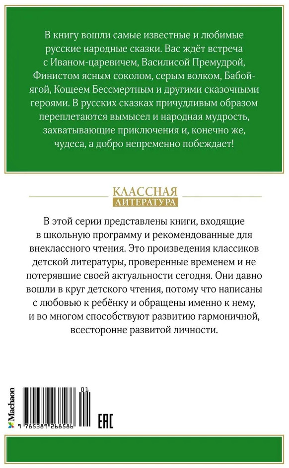 💳 Оплатить за товар можно при получении 🇰🇿 Есть бесплатная доставка по Казахстану от 1 дня 🎁 Копите бонусы с каждой покупки Серия: Классная литература В эту книгу вошли самые известные и любимые русские народные сказки. Вас ждёт встреча с Иваном-царевичем, Василисой Премудрой, Финистом ясным соколом, серым волком, Бабой Ягой, Кощеем Бессмертным и другими сказочными героями. В русских сказках причудливым образом переплетаются вымысел и народная мудрость, захватывающие приключения и, конечно же, чудеса, а добро непременно побеждает! В нашем издании собраны русские сказки, которые входят в школьную программу по литературе и программу внеклассного чтения. Книга с яркими, красивыми иллюстрациями отечественных и зарубежных мастеров станет отличным дополнением к вашей детской библиотеке. |