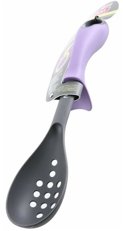 • особый выступ на рукоятке может служить упором, чтобы рабочая поверхность ложки с отверстиями не касалась стола, когда ее надо отложить на время, и не даст соскользнуть в кастрюлю, если зацепить рукояткой за бортик;