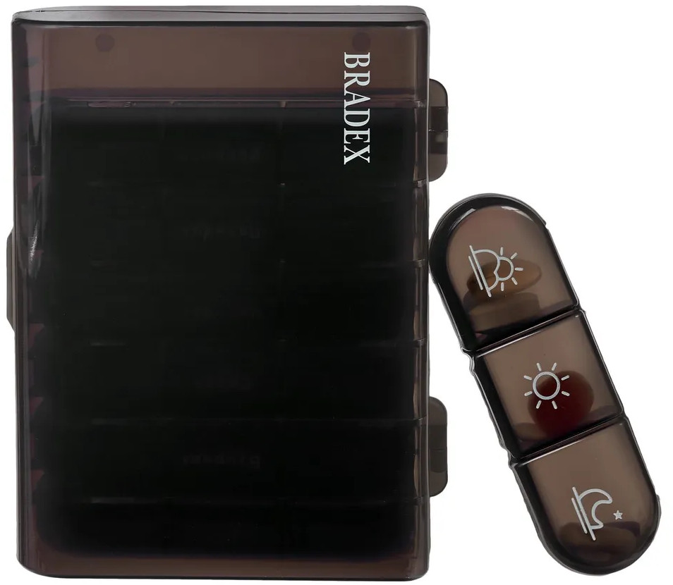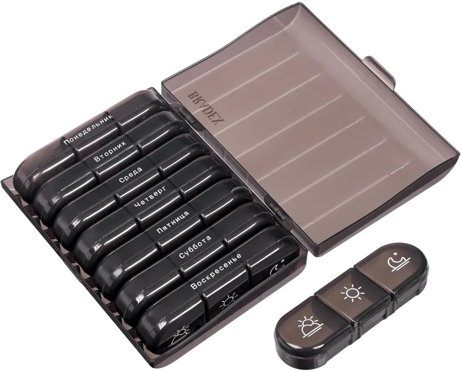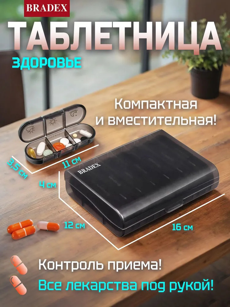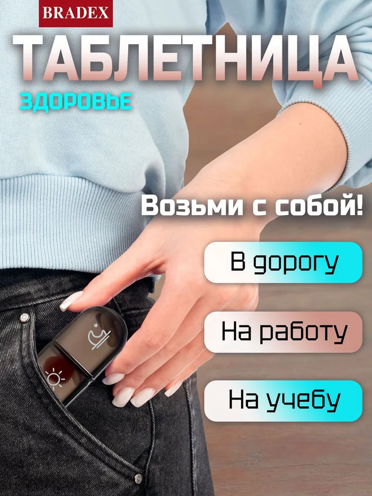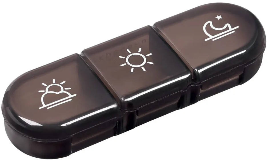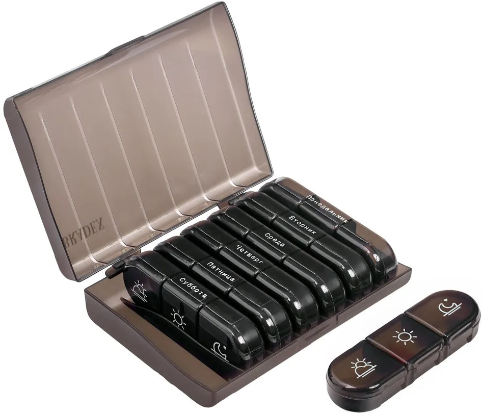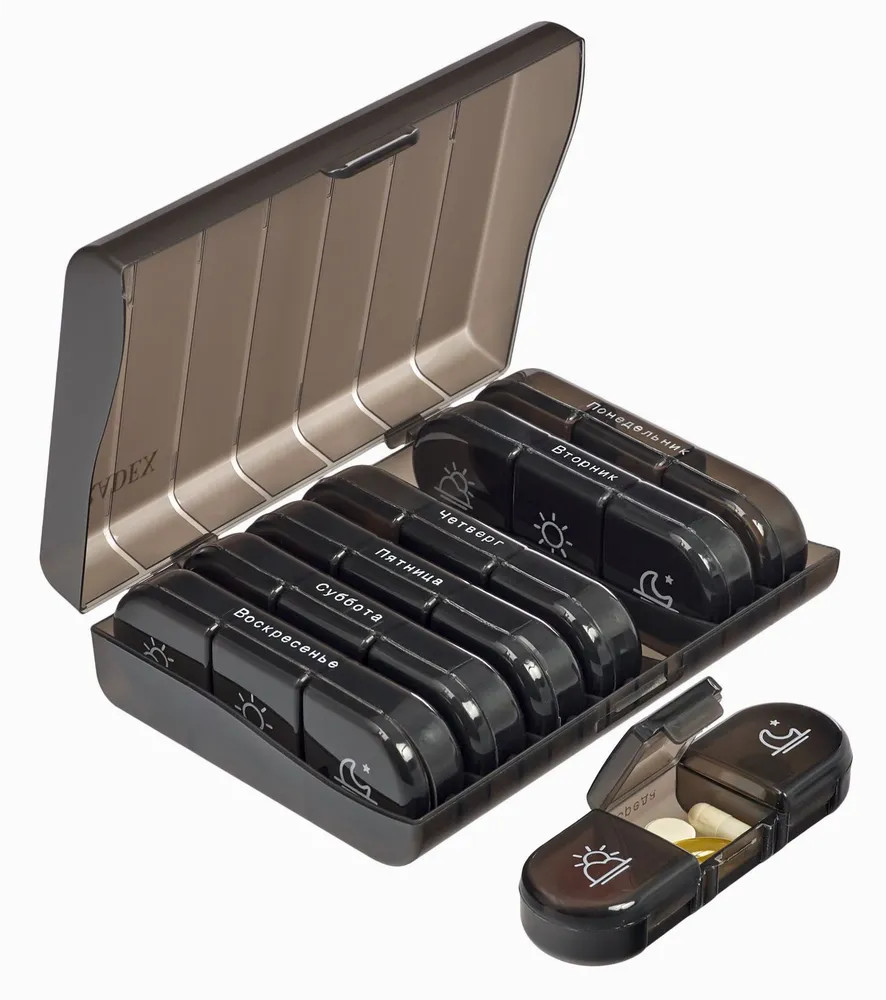 Bradex Контейнер для таблеток «Здоровье»В данный момент этот товар отсутствует в продаже. Возможно, у нас найдется аналогичный или похожий товар здесь. Компактная таблетница подходит для хранения лекарств, витаминов и пищевых добавок. Органайзер содержит семь футляров для распределения таблеток на каждый день недели. Футляры разделены на три отсека с индивидуальной крышкой, что позволяет разложить лекарства и добавки на три приёма в течение дня. Большое количество отсеков и обозначения на крышках облегчают контроль над регулярным приемом медикаментов. Удобная конструкция позволяет извлекать таблетки без особых усилий. Таблетница идеально подходит тем, кому необходимо следить за приемом лекарств. С собой можно взять весь органайзер или футляр на один день. Контейнер выполнен в чёрном цвете и минималистичном дизайне, универсальный помощник для тех, кто ценит свое здоровье и желает упорядочить прием лекарств. С ее помощью вы без труда организуете свой ежедневный график приема препаратов и избавитесь от хлопот, связанных с поиском нужной таблетки. |