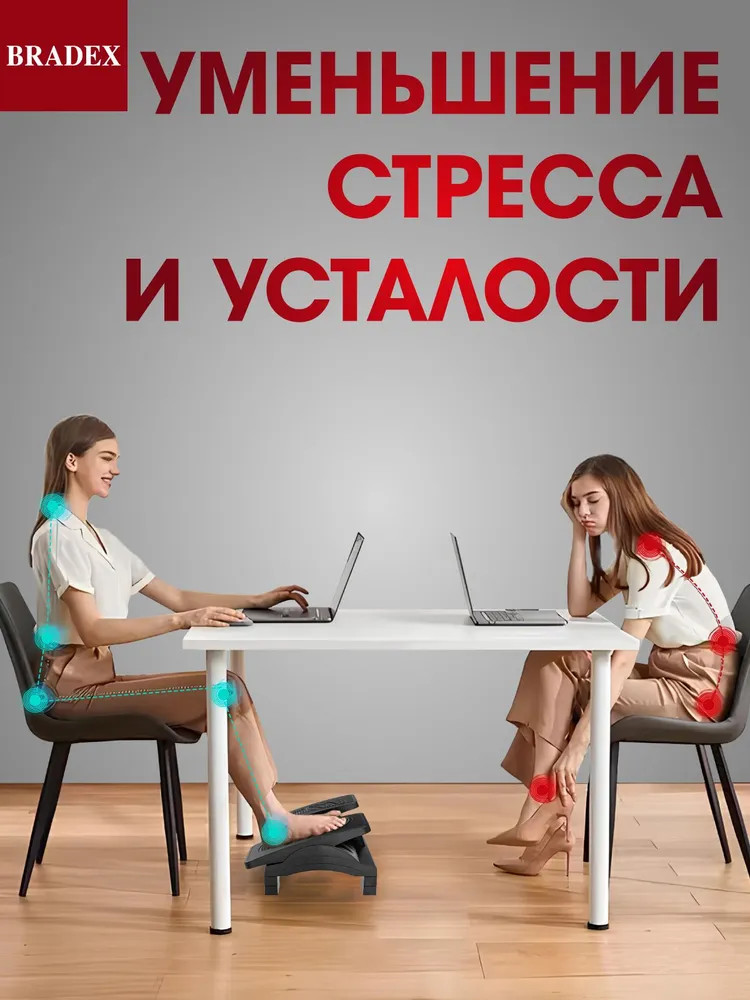 Некоторые точки на стопе связаны с улучшением сна, расслаблением и снятием стресса. Воздействовать на эти зоны можно при помощи более крупных зубчиков между педалями: они мягко массируют подошву, помогая максимальной релаксации. Важно следить за положением стоп: вся поверхность подошвы должна стоять на подставке ровно, без перекосов или неравномерного распределения давления. Оптимальный угол наклона — 15-20 градусов. С эргономичной подставкой для ног рабочий процесс станет более комфортным и продуктивным. Не откладывайте заботу о здоровье на потом — сделайте правильный выбор прямо сейчас!
