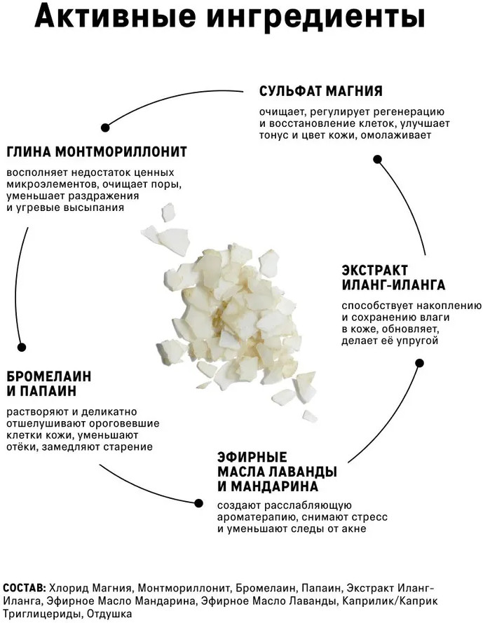 В чем преимущество: хлорид магния в виде хлопьев бишофит представляет трансдермальную форму магния, поэтому легче проникает в глубокие слои кожи и лучше усваивается организмом. Он улучшает гидратацию клеток кожи, усиливая барьерную функцию эпидермиса и уменьшая воспаления. Соль обогащена натуральными фруктовыми ферментами и эфирными маслами, которые мягко действуют на качество и текстуру кожи, придают соли успокаивающий, цветочно-травяной аромат иланг-иланга и мимозы и создают расслабляющий эффект ароматерапии.